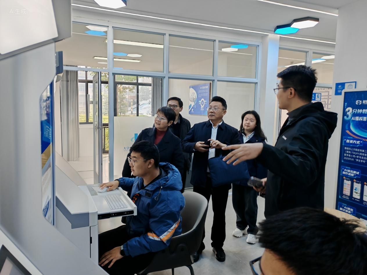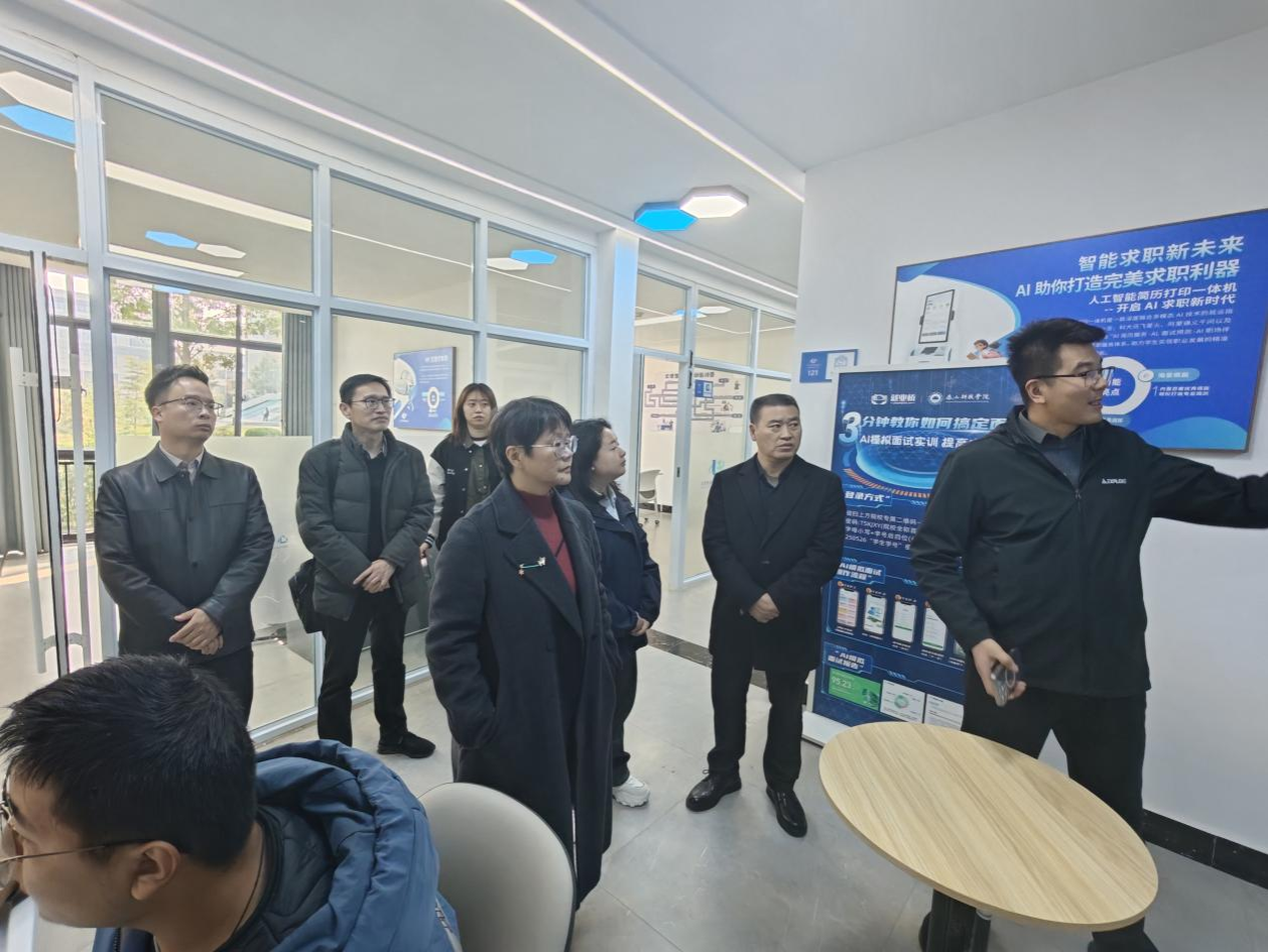 考察团首先参观了就业创业赋能中心。中心负责人刘文斌详细介绍了专区的整体规划、功能布局与运营管理,并重点讲解了各功能模块的特色。现场,一系列智能化服务设施引起了考察团的浓厚兴趣。其中,创新应用的VR职业体验技术,通过构建高度仿真的虚拟工作场景,为学生提供了沉浸式的职业认知体验,成为一大亮点。此外,AI智能面试舱、智能简历一体机等数字化设备的实际应用,也赢得了考察团的高度评价,成员们饶有兴致地进行了亲身体验。