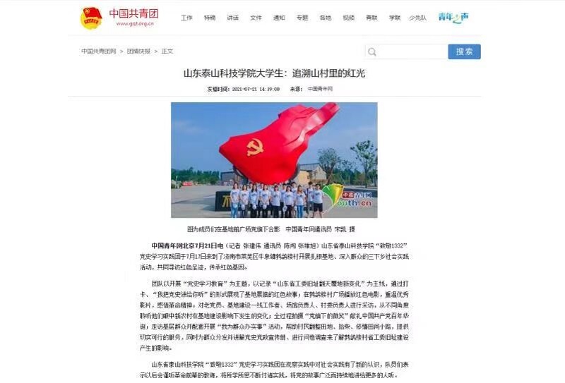 7月21日,共青团中央官网以《山东泰山科技学院大学生致敬1332:追溯山村里的红光》为题,关注报道我校2021年暑期“三下乡”社会实践团队——致敬“1332”党史学习实践团在实践活动中的突出表现,这也是我校团学工作首次被团中央关注报道。此外,中国青年网等主流媒体分别以《致敬1332:探访乡村变化,倾听民众心声》《致敬1332:村庄换新颜,村民展笑颜》为题陆续报道了我校暑期“三下乡”社会实践活动。