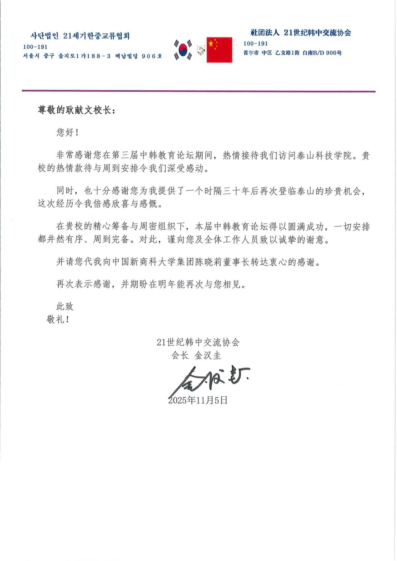 金汉圭会长在信中还特别提到:“贵校的热情款待与周到安排令我们深受感动。同时,也十分感谢您为我提供了一个时隔三十年后再次登临泰山的珍贵机会,这次经历令我倍感欣喜与感慨。请您代我向中国新商科大学集团陈晓莉董事长转达衷心的感谢。期盼在明年能再次与您相见。”