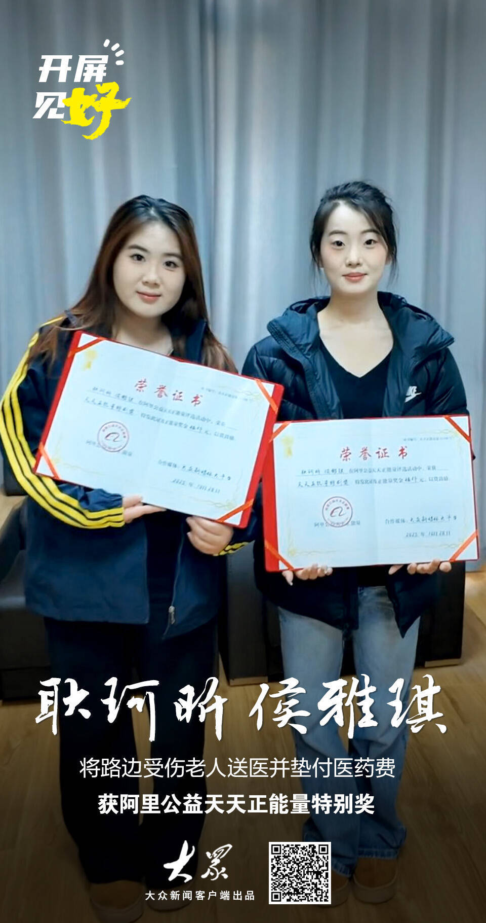 阿里公益天天正能量决定联合“大众”新媒体大平台,为耿珂昕、侯雅琪颁发天天正能量特别奖及奖金5000元:
