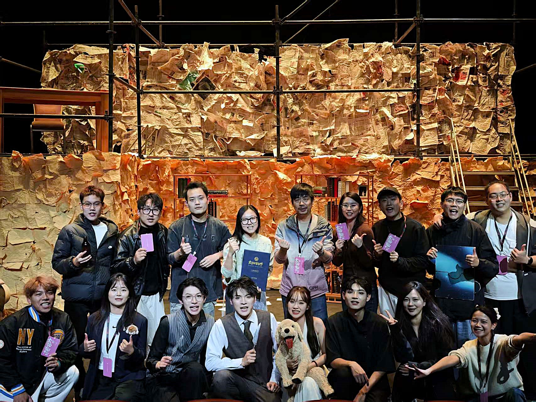 11月8日清晨4点,《笔尖·心跳》剧组17人在制作人、艺术教育中心主任锂洋,编剧、导演、音乐剧产业学院主管李文霖,执行导演、艺术教育中心教师赵彤彤等的带领下踏上第七届大凉山国际戏剧节征程,师生们转乘三种交通工具,傍晚抵达听涛谷。稍作休整后,剧组人员便前往剧场考察。次日晚21:00,上一剧组演出结束,他们迅速投入装台合光。由大剧场变为小剧场沉浸式演绎,需修改演员调度,团队顶着压力工作至凌晨2:30,确保每个细节完美。