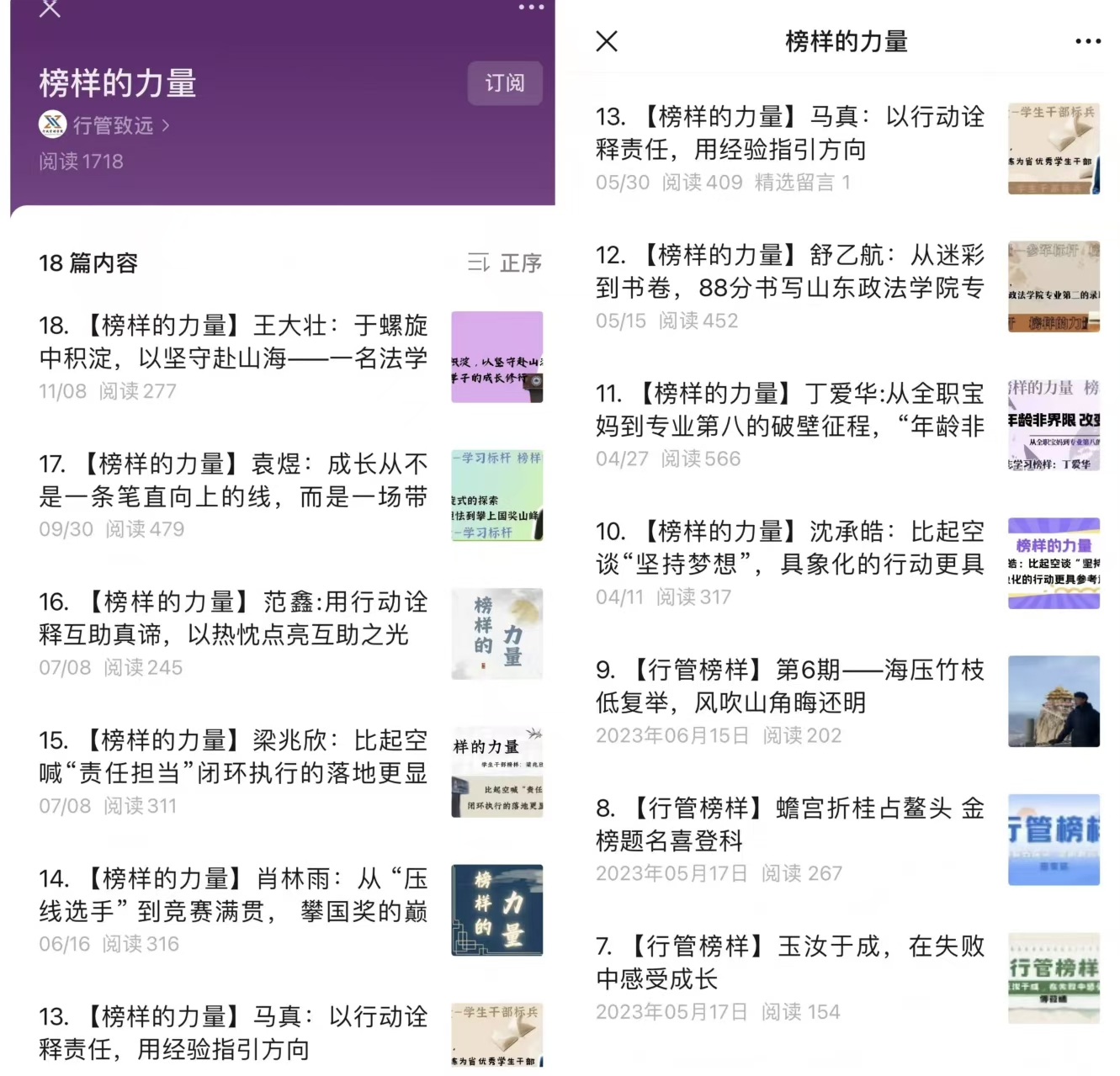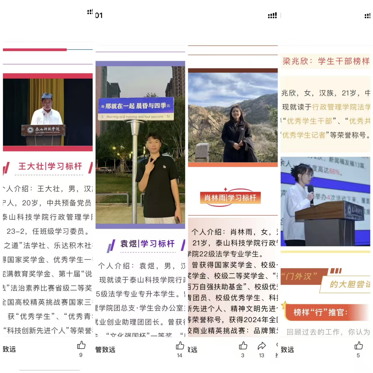 学院大力选树多层次先进典型,覆盖国家奖学金、泰科之星、法律职业资格考试通过者等各类榜样。通过学院官网、“行管致远”公众号、宣传栏等平台开展“榜样力量”、“追光者说”系列巡展,讲述优秀学子成长故事。实施“学霸宿舍”与“学霸集体”创建工程,将宿舍学风、班级平均绩点、课堂抬头率、竞赛获奖等纳入评选体系,打造身边可学的学风标杆,让追求卓越成为校园新风尚。