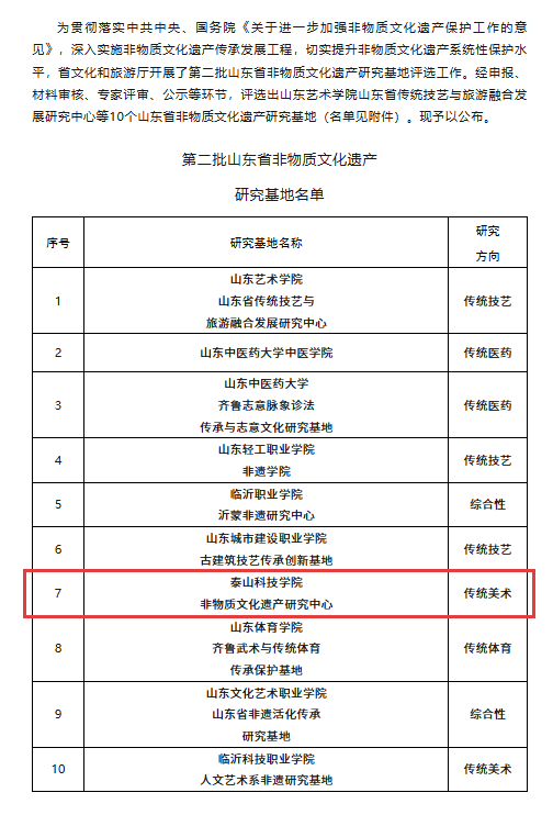 近日,山东省文化和旅游厅公布第二批省级非物质文化遗产研究基地名单,泰山科技学院非物质文化遗产研究中心凭借扎实的建设基础、突出的育人成效与广泛的社会影响成功入选。在全省非遗研究基地中民办高校仅有2所,占比不足5%,中心的成功入选标志着学校非遗研究与文化育人工作迈入高质量发展新阶段。