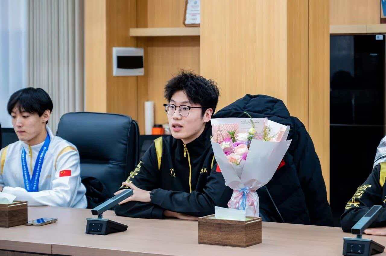 当日下午,学校在明心书院为游泳队举行欢迎仪式。集团行政总裁王征、学校常务副校长谢承红等向教练员与运动员献花祝贺。