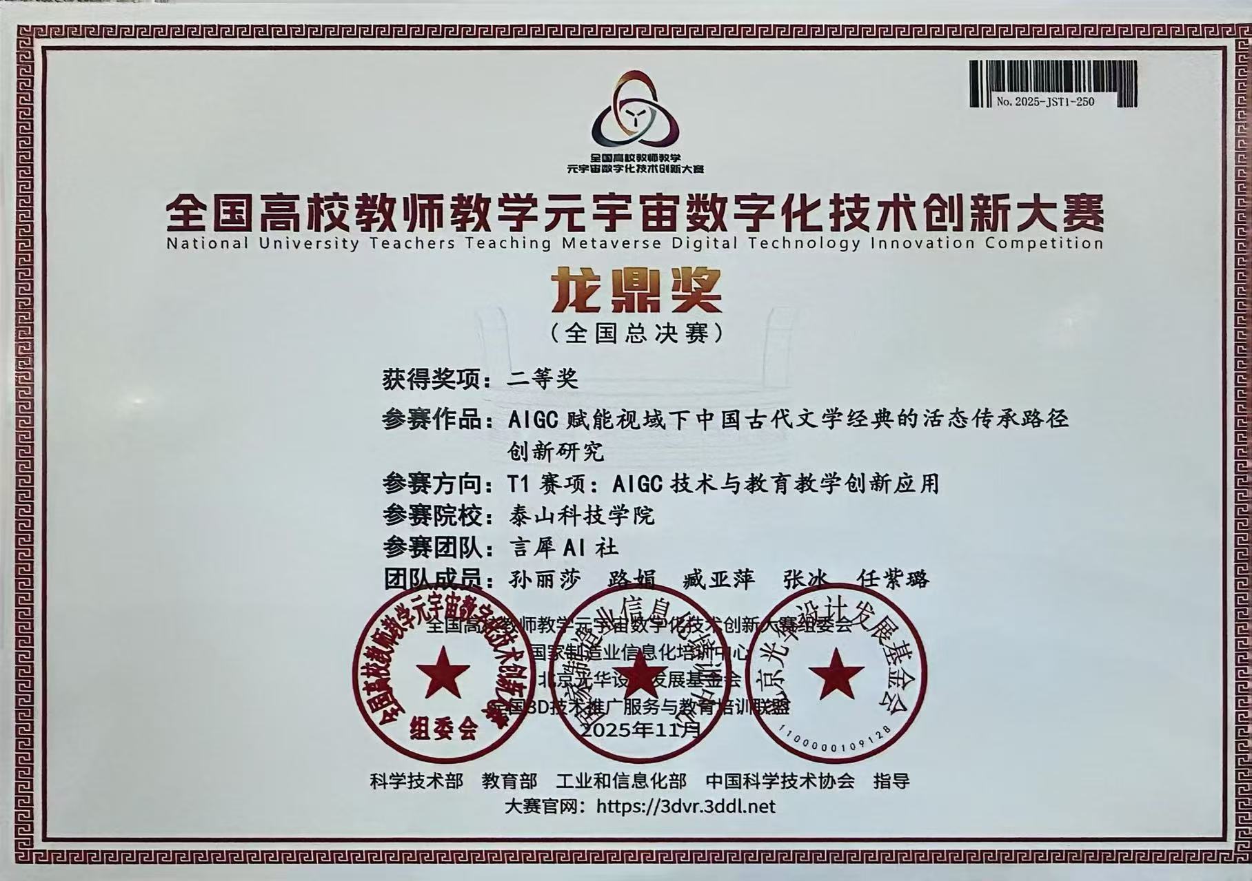 近日,第六届全国高校教师教学元宇宙数字化技术创新大赛全国总决赛圆满落幕。泰山科技学院行政管理学院教师孙丽莎带领的言犀AI社团队,凭借作品《AIGC赋能视域下中国古代文学经典的活态传承路径》,在“AIGC技术与教育教学创新应用”赛道中表现优异,荣获全国总决赛二等奖。