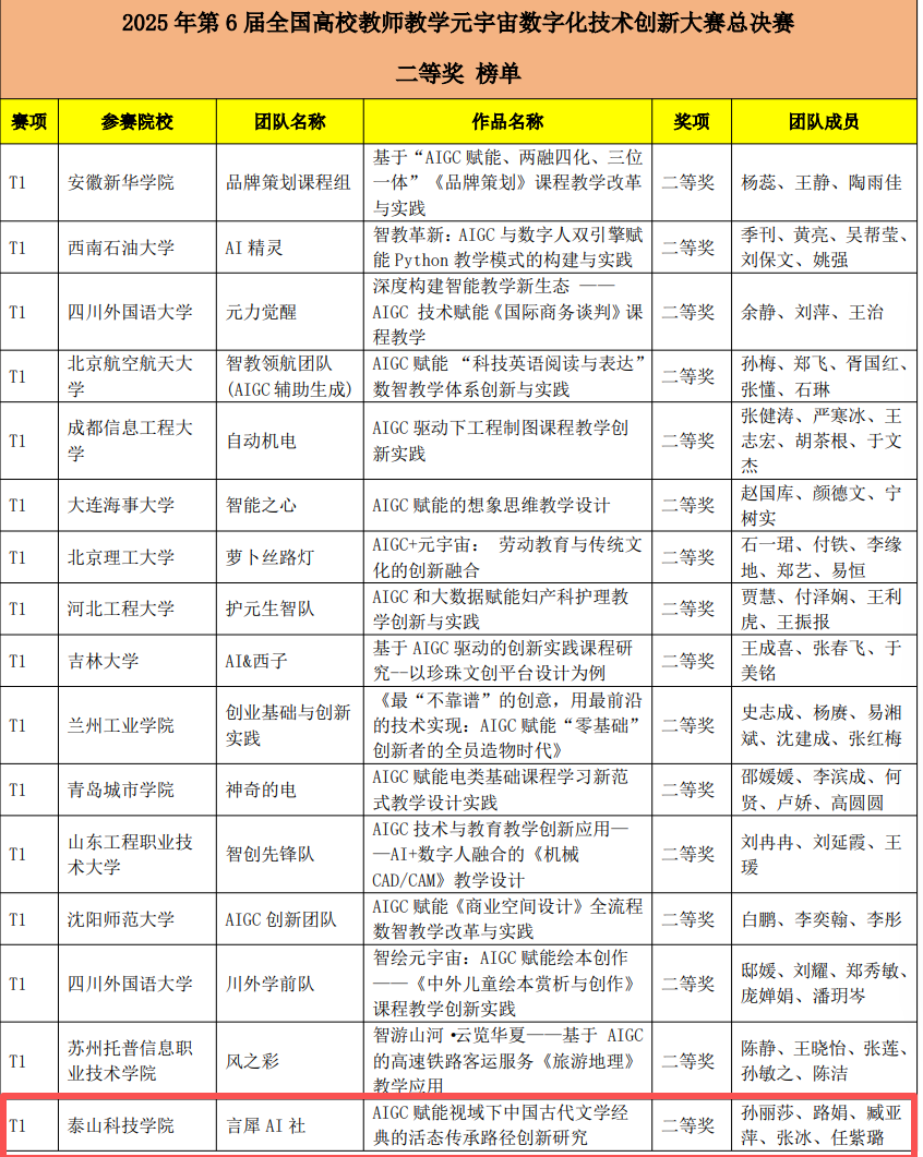 自备赛以来,泰山科技学院高度重视,在各级领导的统筹指导下,参赛团队深入研讨,聚焦“AIGC+古代文学经典传承”方向,探索人工智能生成内容技术在传统文化教育中的创新应用。参赛作品兼具学术前沿性与教学实用性,以鲜明的特色与扎实的设计赢得专家一致认可。