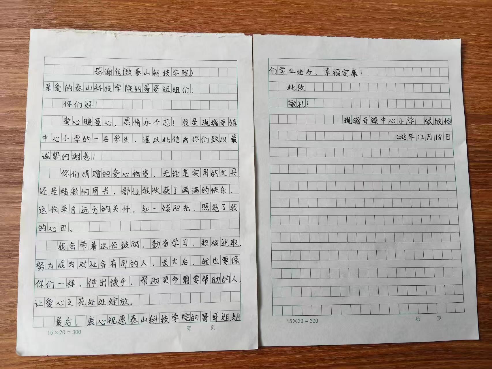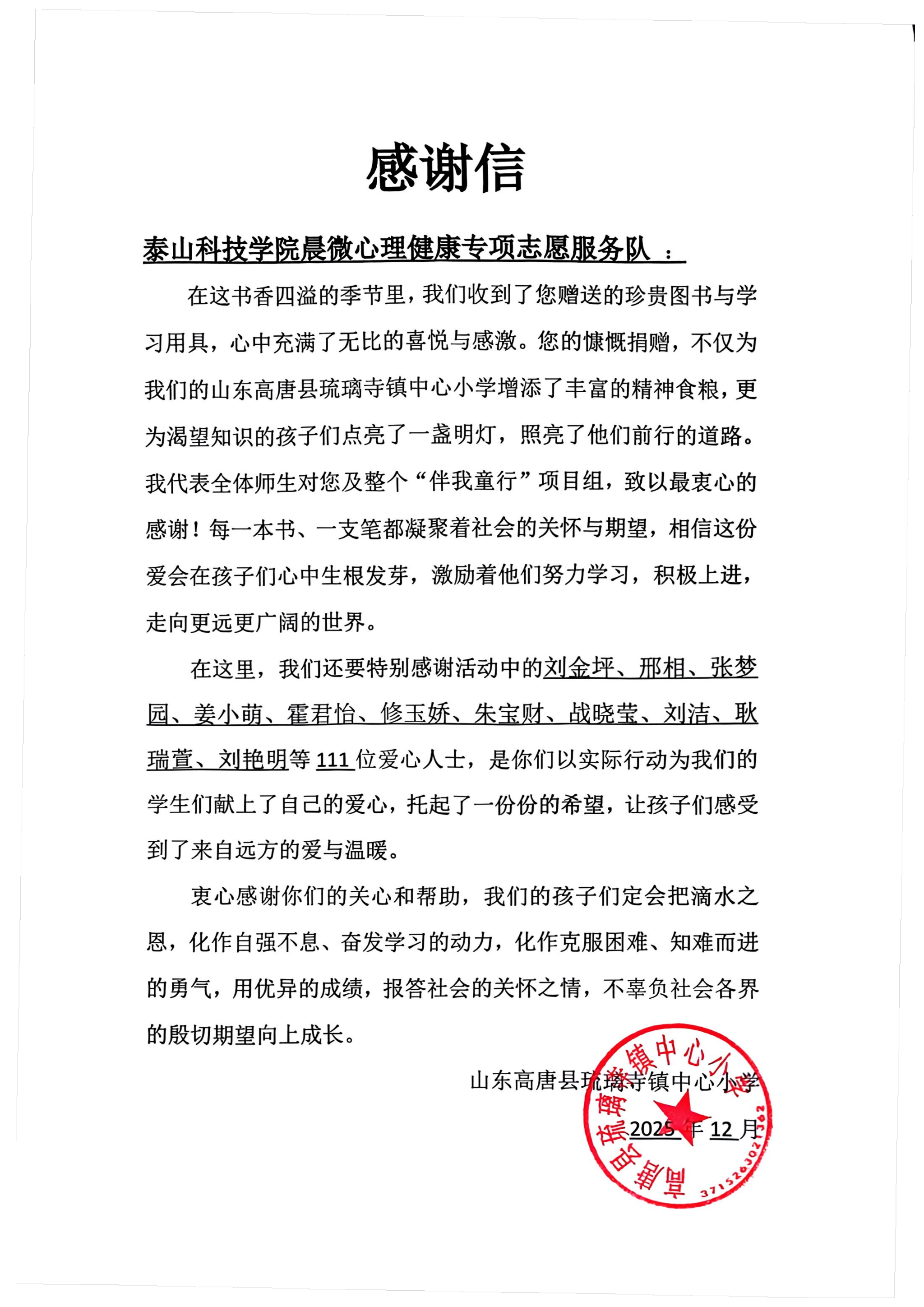 近日,泰山科技学院收到了一封来自聊城市高唐县琉璃寺镇中心小学的感谢信。信中,该校师生对泰山科技学院“晨微”心理健康专项志愿服务队开展的“以书易物,信笺传情”公益活动表达了诚挚的谢意,并特别提及该校张欣怡同学对哥哥姐姐们的感激之情。