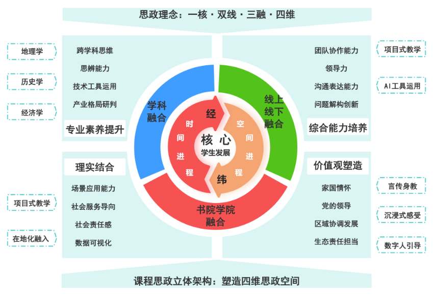 在思政育人方面,课程注重将价值塑造融入知识传授,积极探索“大思政课”理念下的教学创新。通过构建“一核·双线·三融·四维”立体化思政架构,推动思政元素与专业知识有机融合,实现思政教育如盐在水、润物无声,有效延伸至课程教学全环节。