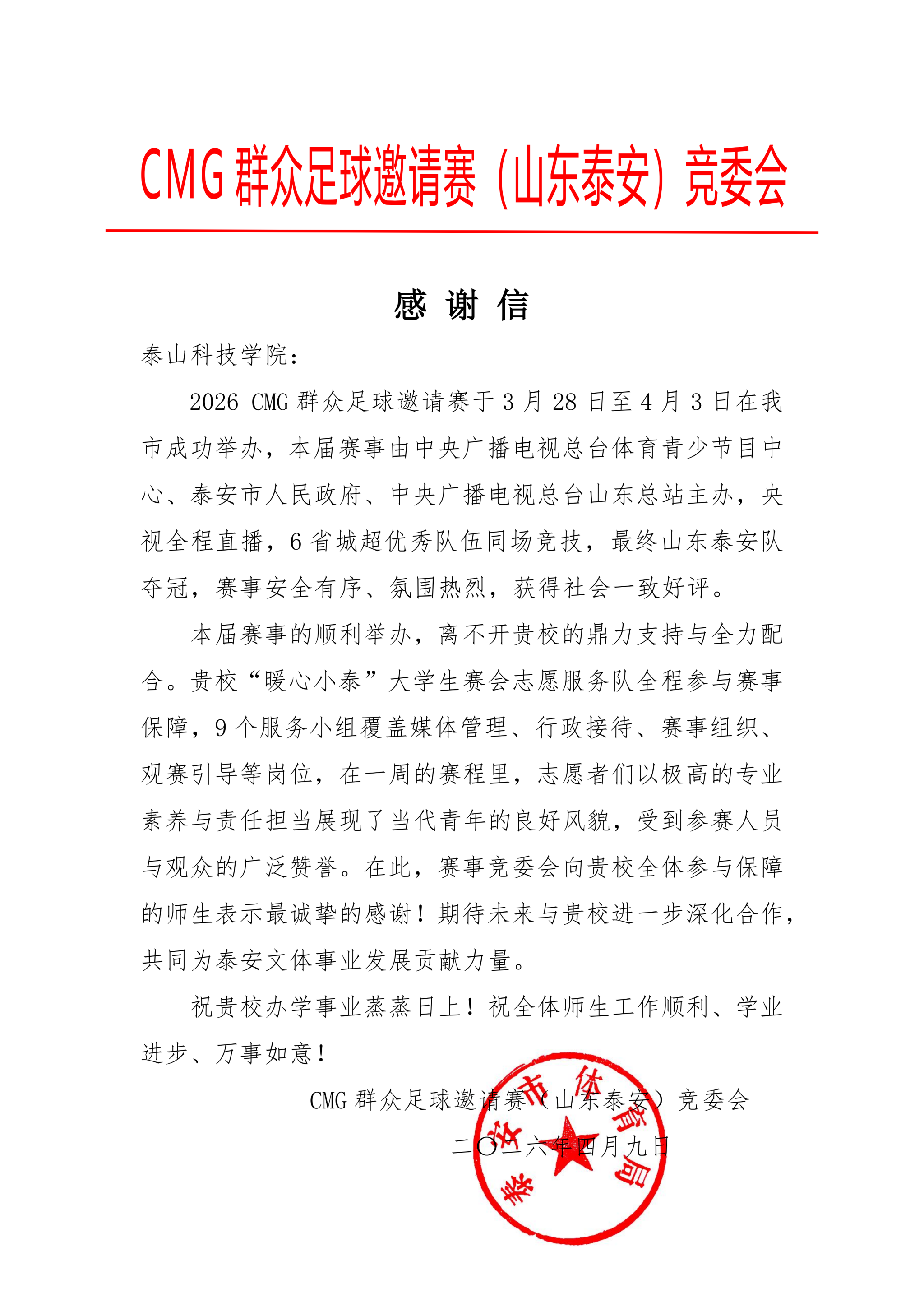 近日,CMG群众足球邀请赛(山东泰安)竞赛委员会向泰山科技学院发来感谢信,对学校在赛事期间提供的鼎力支持表示衷心感谢,并对“暖心小泰”大学生赛会志愿服务队在志愿服务工作中展现出的专业能力和高度责任感给予充分肯定。