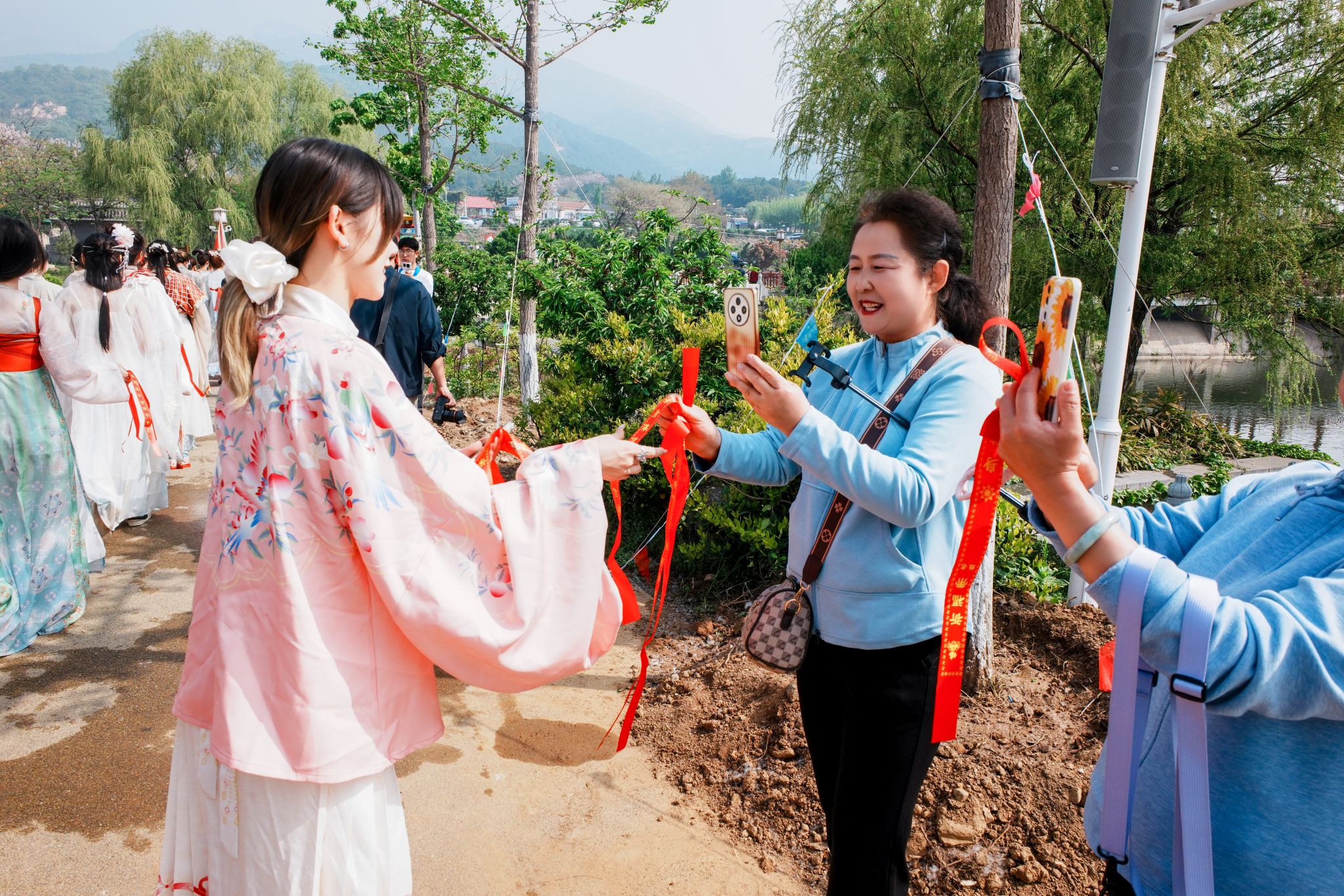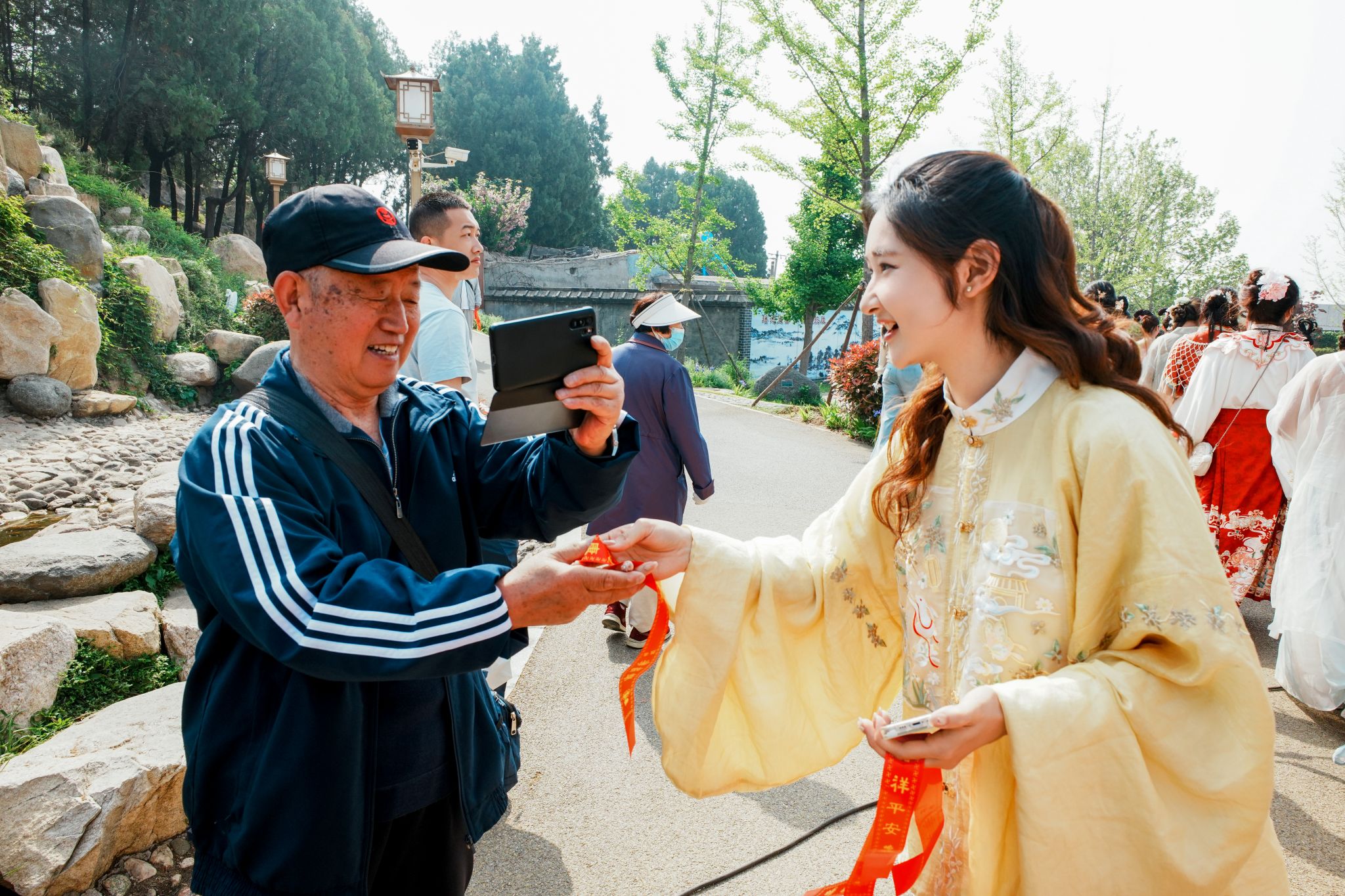 在“蟠桃赐福”互动区,来自泰山科技学院的学生身着汉服,化身古代NPC,热情引导游客参与沉浸式体验。他们免费向游客赠送蟠桃造型面点、祈福丝带,并协助开展汉服游仙打卡、古风游戏等项目,让游客在互动中感受传统文化的独特魅力。与此同时,学院青衿舞朝社带来了古典舞《会开花的云》,舞者们以轻盈灵动的舞姿对话古今、传承千年,赢得现场观众的阵阵掌声。