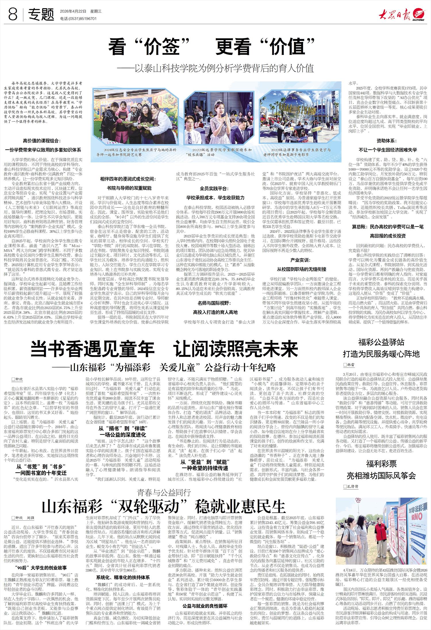 4月22日,《大众日报》刊发题为《看“价签” 更看“价值”——以泰山科技学院为例分析学费背后的育人价值》的深度报道。在高等教育从“学历供给”转向“能力供给”的背景下,该报道以泰山科技学院为样本,深入剖析高校学费背后的育人资源供给逻辑,引发广泛关注。