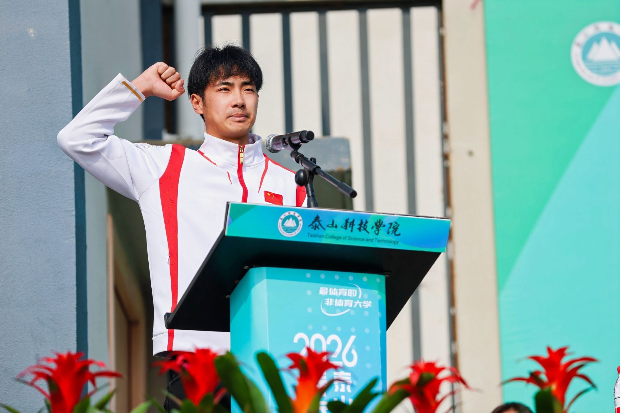 谢承红在致辞中表示,健康是立身之本,体育是强国之基。学校始终将体育工作作为立德树人的重要环节,推动体育教育与人才培养深度融合,让体育成为滋养每位学子生命成长的必修课。他介绍到,过去一年,泰山科技学院体育工作取得丰硕成果:学校游泳队在第24届中国大学生游泳锦标赛(北方赛区)中夺得9金7银2铜,6次打破赛会纪录,荣获乙组团体总冠军,创造了非体育类高校在全国性游泳赛事中的历史最好成绩;和球队代表山东省出征全国比赛获第四名;铁人三项队首次参加中国超级铁人三项赛即获团体季军;足球队获山东省大学生足球联赛亚军;男篮首捧山东省大学生三人制篮球联赛冠军;女篮在CUBAL联赛中获山东省亚军;武术队获全国大学生长短兵团体冠军;田径队获全省团体冠军。谢承红表示,“体育育人、淬炼精神、锻造人格”的主张已通过公共游泳必修课、营地教育、淬炼领导力课程、素质拓展、泰山野战训练营、校队开放日、开学第一跑、40公里计划、全年12200余场体育赛事等载体,融入师生日常。