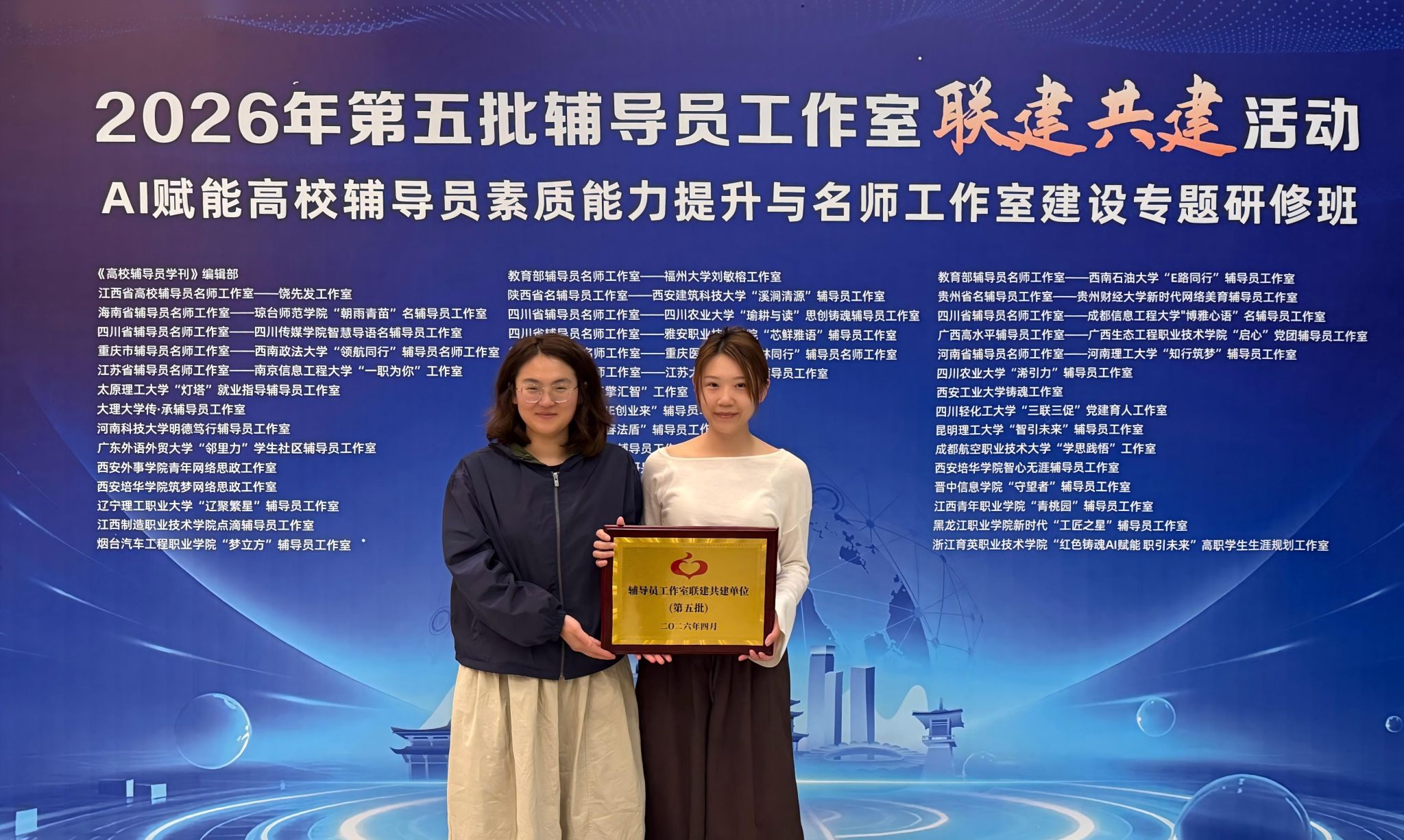 为深化联建共建工作、提升辅导员AI赋能育人能力,工作室派出薛珊、王彦颖两位教师赴西安参加“AI赋能高校辅导员素质能力提升与名师工作室建设专题研修班”。研修班围绕AI赋能辅导员素质能力跃升、名师工作室建设与体系化发展、精品项目培育与申报能力提升等内容展开,为工作室对标全国一流、加强跨校联动、实现优质资源互通与育人经验互鉴提供了宝贵契机。