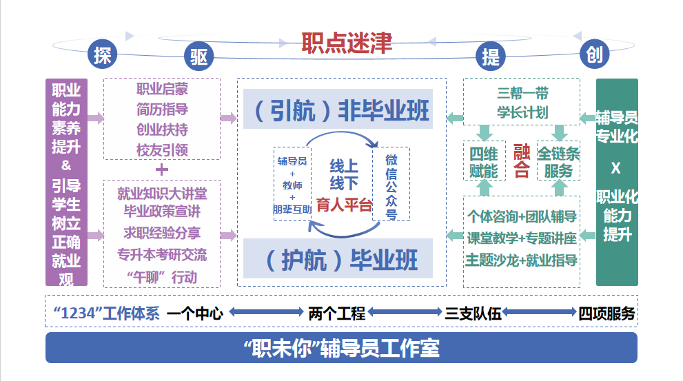 “职未你”辅导员工作室致力于打造集服务师生、理论研究、交流培训等职能于一体的综合性辅导员职业能力发展平台。工作室紧紧围绕“以学生发展为中心”的核心理念,构建了“1234”工作体系:打造线上网络育人平台与线下书院社区实体育人平台;建设辅导员队伍、专业教师队伍、朋辈互助队伍三支力量;提供精准化网络宣传、暖心化辅导交流、进阶化赋能培训、科学化理论研究四项服务。通过贯通不同学院、层次、年级、专业学生的需求,打通辅导员职业壁垒,有效助力学生职业发展。