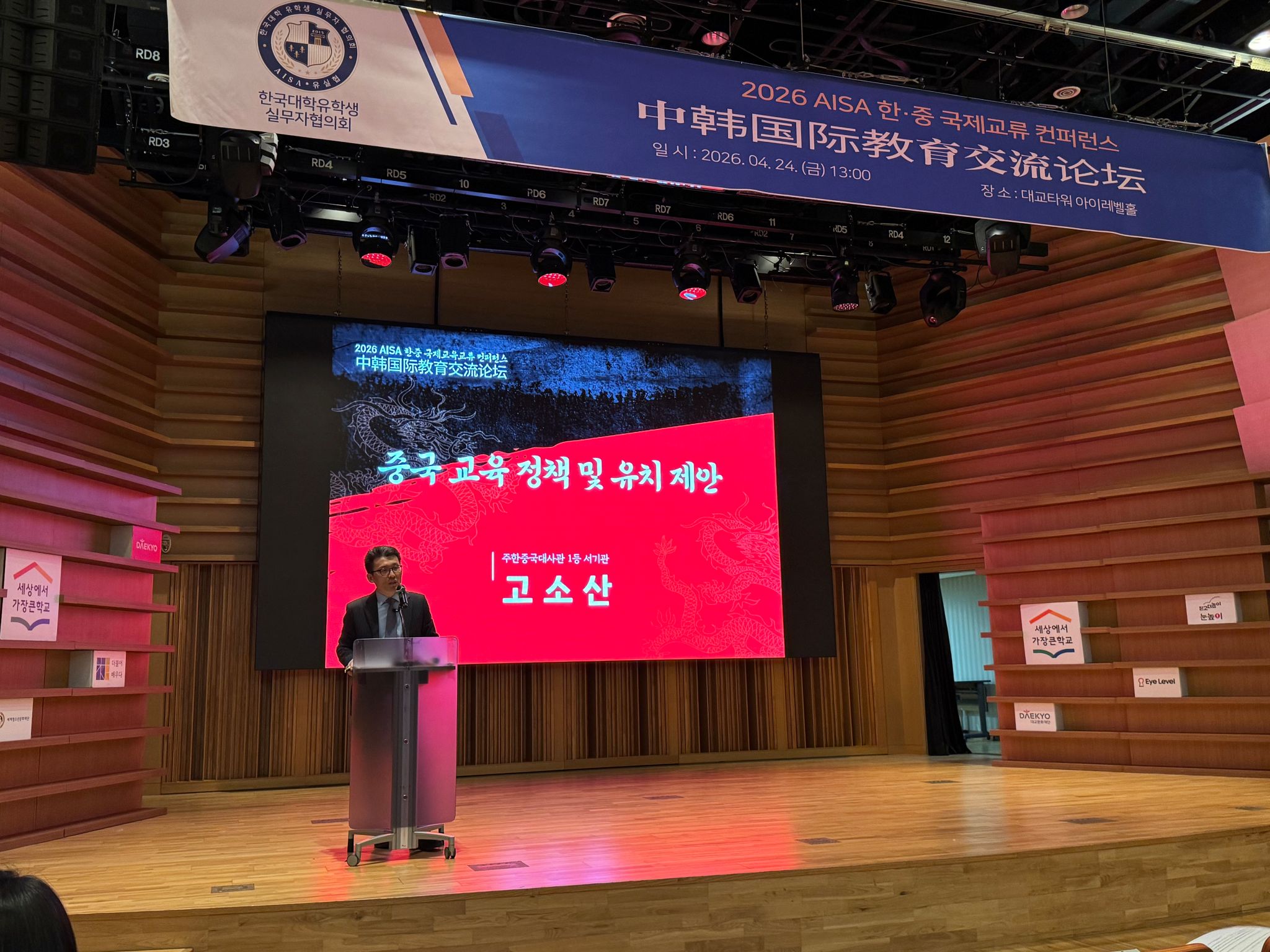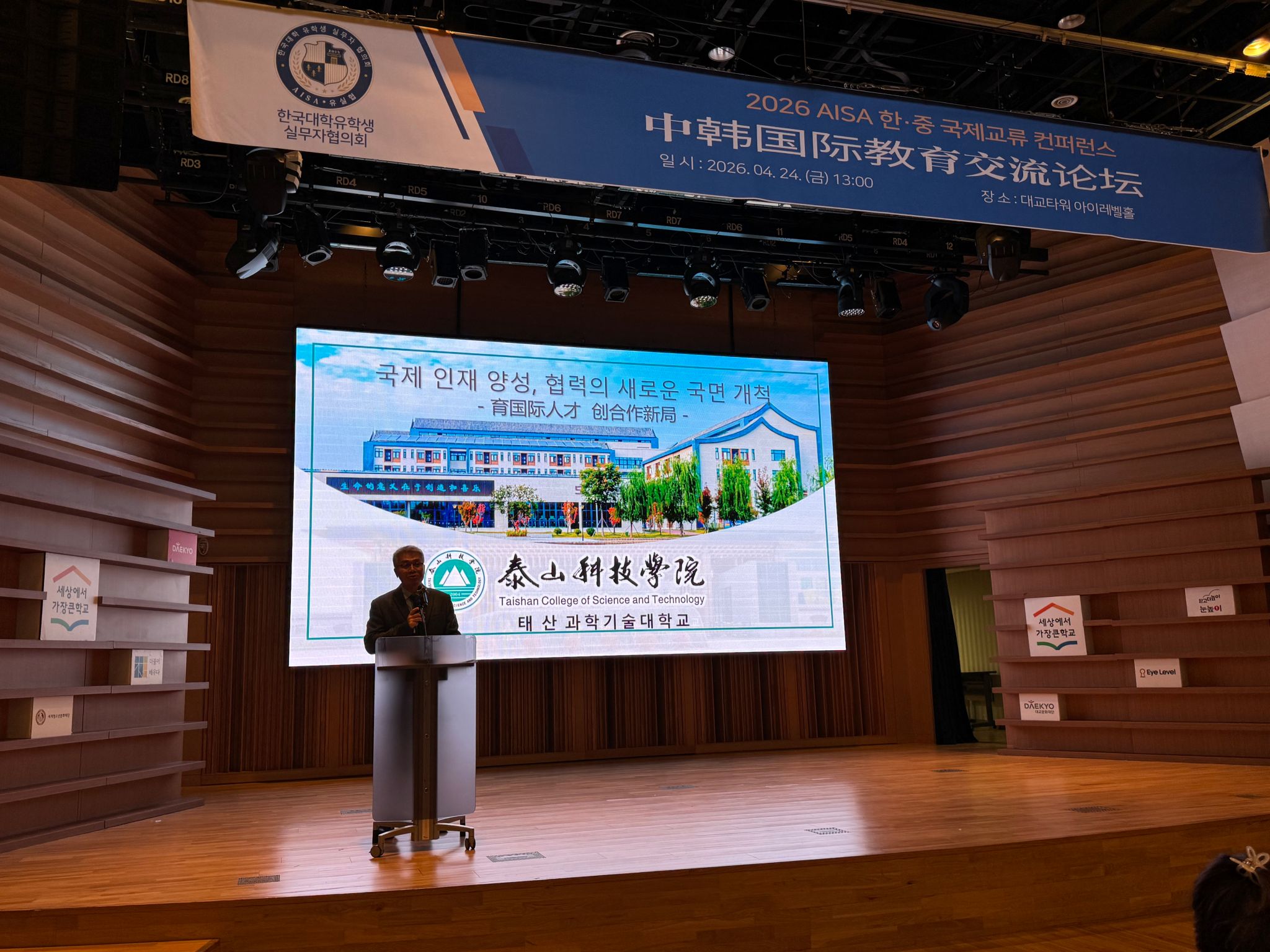 4月24日,“2026年中韩国际教育交流论坛”在韩国首尔隆重举行。本次论坛汇聚了来自韩国约50所高校的国际交流部门负责人及相关人员共计110余人,围绕中韩教育合作、国际学生培养及来华留学发展等核心议题展开深入交流。泰山科技学院副校长智英斌受邀出席并作主旨报告,国际教育学院、中韩学院有关教师一同参会。