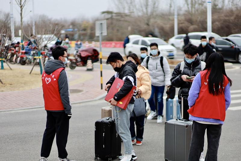 同学们在校门口排队入校,经过健康码检查、体温检测、学生证核验、省外返校的同学进行入鲁返鲁人员信息登记等程序依次通过入校通道进入校园。校领导来到校门口,检查指导入校通道运行情况,确保每一个环节都完美顺畅,让前来送行的家长安心,让欣然归来的学生放心。