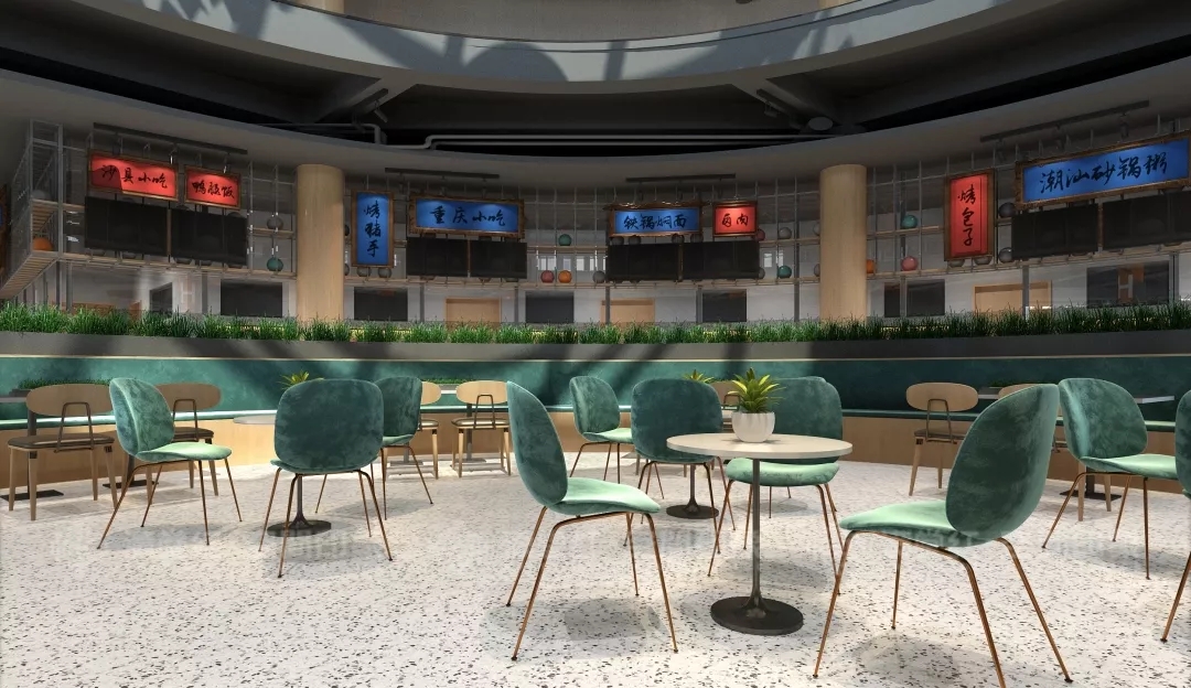 中厅采用下沉式,打破以往学校餐厅布局中的陈规,创造了一个动线丰富的空间序列,墨绿、明黄等色彩点缀让空间色彩更添活力。