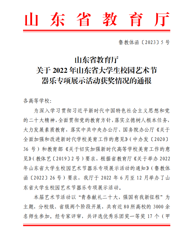 日前,山东省教育厅公布山东省大学生校园艺术节器乐专项展示活动获奖情况,我校艺术教育中心器乐指导教师胡婷、马煊带领大学生艺术团器乐分团演奏的原创民族器乐作品《泰山谣随想曲》获得甲组三等奖。