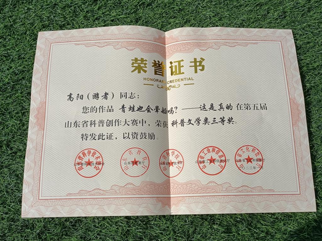 2023年2月,第五届山东省科普创作大赛公布获奖作品、作者名单。我校蓬莱科幻学院教师高阳(笔名游者)编写的科普图书《我们的微生物世界——传染病防控科普读本》荣获科普出版物一等奖;原创科普作品《奇特的小白蚊——嗜血杀手改良记》《青蛙也会晕船吗?——这是真的》分别荣获科普文学类作品二、三等奖。