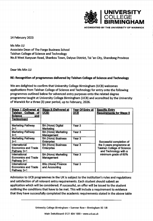 泰山科技学院3年制专科学生,可以申请UCB top-up项目,衔接本科最后一年,并有机会拿到华威大学本科学位。专科学生仅用最快1年时间即可拿到世界百强院校本科学历,且学位被中国教育部认可,是目前英国专升本项目中排名最高的院校。