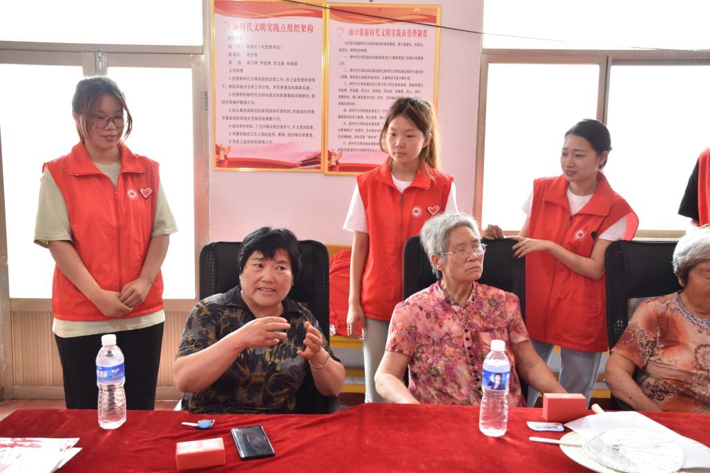 老党员们手握着自己亲手创作的扇子与志愿者们亲切交谈,脸上洋溢着幸福的笑容。那是对年轻一代的肯定与期待,也是对红色文化得以传承的欣慰与自豪。一位奶奶感慨地说:“看到现在的年轻人能够积极传承红色精神,我们真的很开心。希望你们能够不忘初心,铭记历史,继续发扬中国特色社会主义精神和伟大革命精神,让红色文化在新时代绽放出更加璀璨的光芒。”