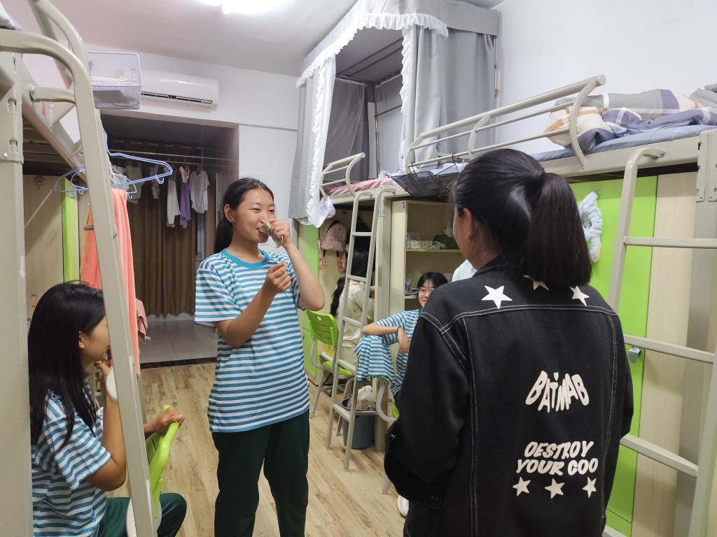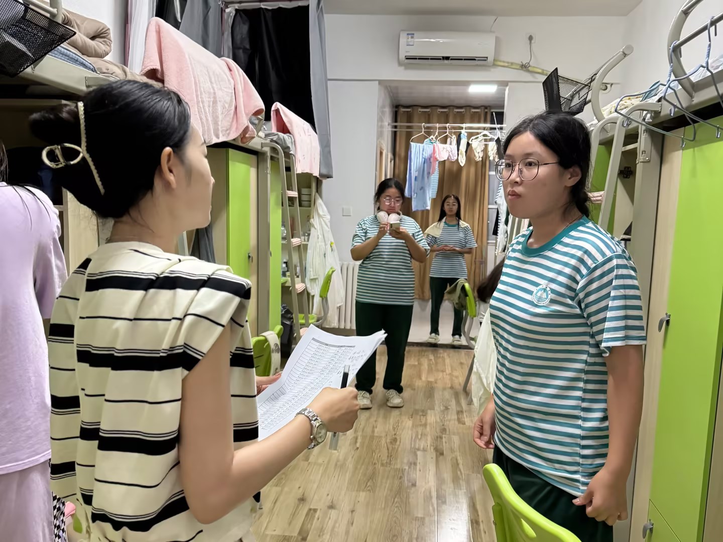 辅导员展羽在走访宿舍时提醒大家要做到以下几点:首先,中秋节恰好在军训期间,一定要遵守学校规定,听从教官指挥,确保军训安全开展。由于军训天气比较炎热,要做到不私自下水、不去不熟悉的水域游泳;其次,健康上网,杜绝沉溺,长时间迷恋网友影响身心健康;再次,防范诈骗“陷阱”,个人信息要保密,不明链接不要点、不熟悉号码不要接;最后,也要注意饮食安全,不暴饮暴食、乱吃冷饮。同时辅导员展羽在进行宿舍安全检查时也强调,留校生活期间遵守校规校纪,宿舍严禁使用违章电器,不赌博、不留宿校外人员;离开寝室去军训时注意锁门关窗,及时关闭电源,真正做到“安全不放假”。