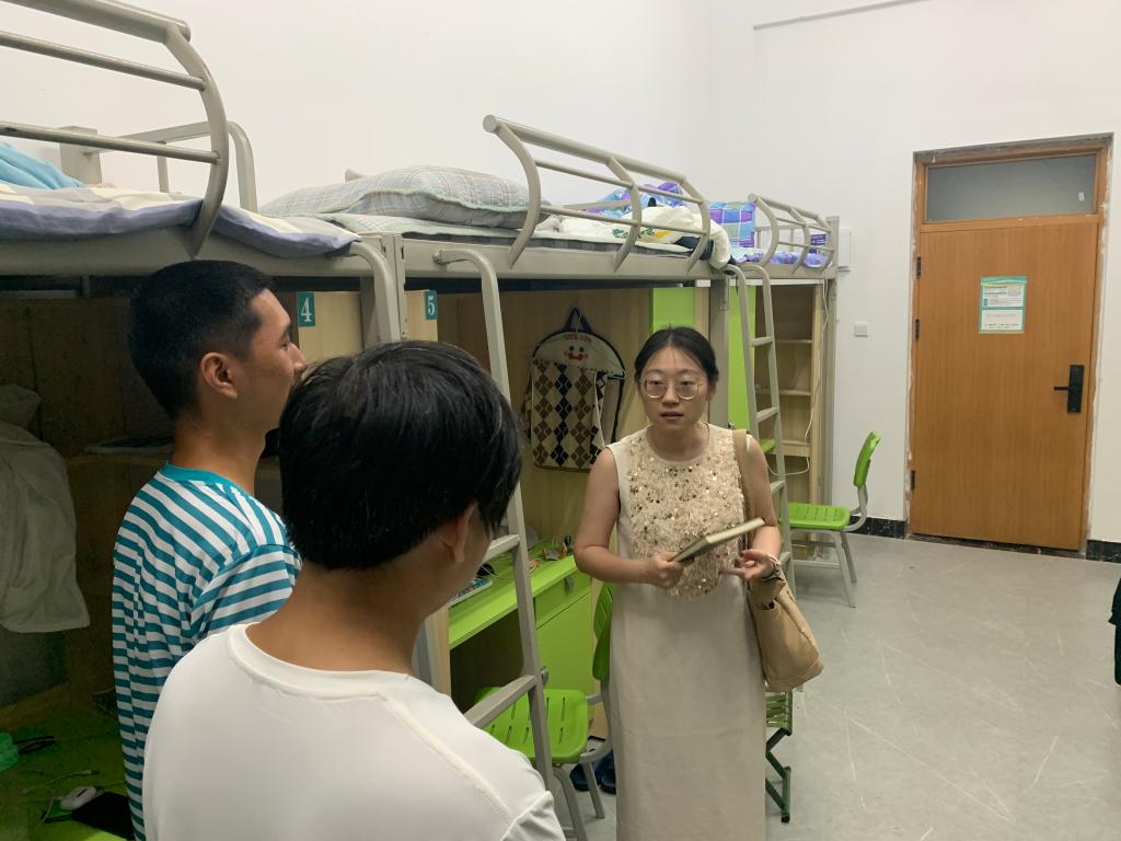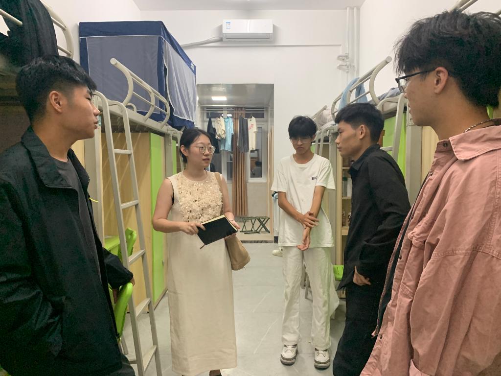 辅导员张田迪提醒同学们提高防范安全的能力和遵守纪律意识,懂得在校园中注意各个方面的安全,时时处处注意安全,遵守纪律,避免形成懒惰松散的习惯。走访宿舍过程中,张老师着重强调宿舍卫生和安全问题,并向学生说明临近中秋节的放假安排,强调休息期间行程报备,始终注意人身、财产、交通安全问题。近期在军训期间,请假人较多,通过查寝的方式,了解最近他们的身体状况,以及心理压力,与室友相处情况。强调军训期间的纪律,认真对待军训,在军训期间不能私自离开队伍,请假及免训的都要在相对应的地方休息,有事请假。同时临近中秋,也向学生说明军训期间中秋安排,调整心态。