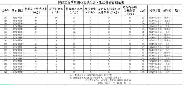 为了进一步加强校园文明建设,加强宿舍安全管理,营造良好的宿舍环境,同时增进与同学们的互动交流。智能工程学院团总支· 学生会生活部部长卢元泽,干事司翔宇、季思辰、梁鑫如等人于2024年12月13日下午18:00对智能工程学院学生宿舍进行了安全、卫生等方面的检查。