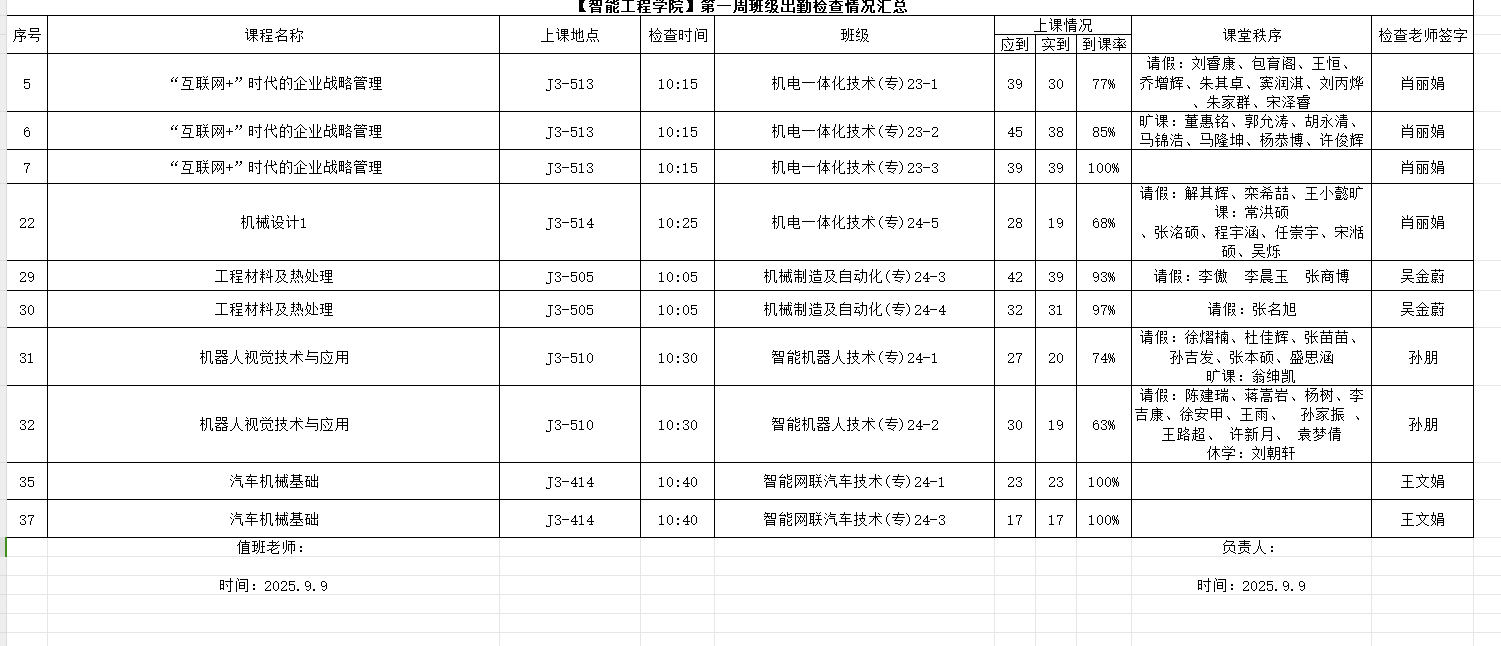 辅导员与任课老师们仔细沟通交流,确保查课的有效性和真实性,切实了解学生们在课堂中的真实状态。本周学风建设课堂检查活动,对智能网联汽车技术(专)24-1、智能网联汽车技术(专)24-3机电一体化技术(专)24-5、机电一体化技术(专)23-3、机械制造及自动化(专)24-3、机械制造及自动化(专)24-4、机电一体化技术(专)23-1、机电一体化技术(专)23-2、智能机器人技术(专)24-1、智能机器人技术(专)24-2。共10个班级进行了检查,具体结果如下:
