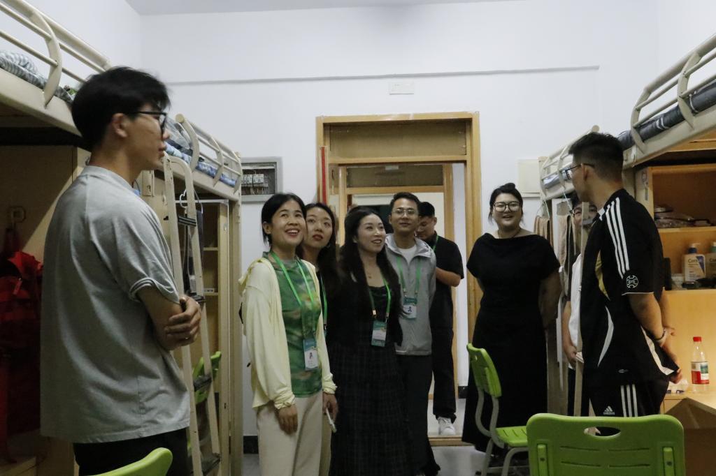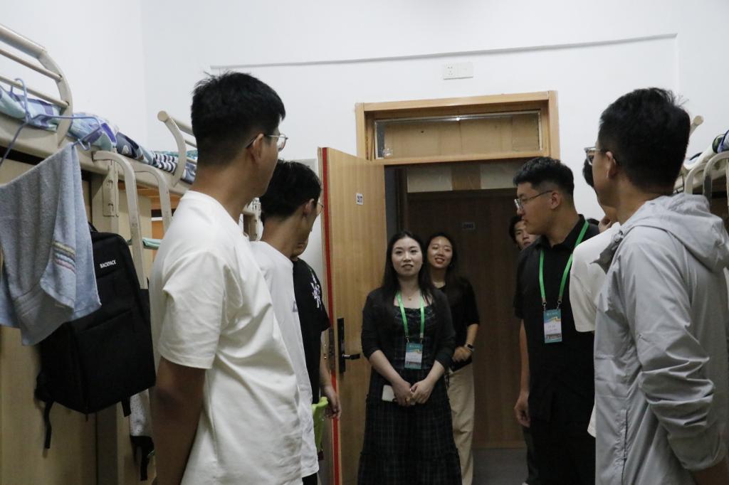 每到一间寝室,老师们都与同学们亲切打招呼:“来自哪里?”“饮食还习惯吗?”“对大学环境适应得怎么样?”一句句贴心的话语瞬间拉近了师生间的距离。老师们细致地询问了同学们入学后的感受,认真倾听同学们分享初入大学的新奇与憧憬,并就大家关心的学业规划、社团活动、校园生活设施等问题给予了详细解答和积极引导。并叮嘱同学们新环境也意味着新机会,要尽快转变角色,熟悉新环境,合理安排时间,做好学业规划。