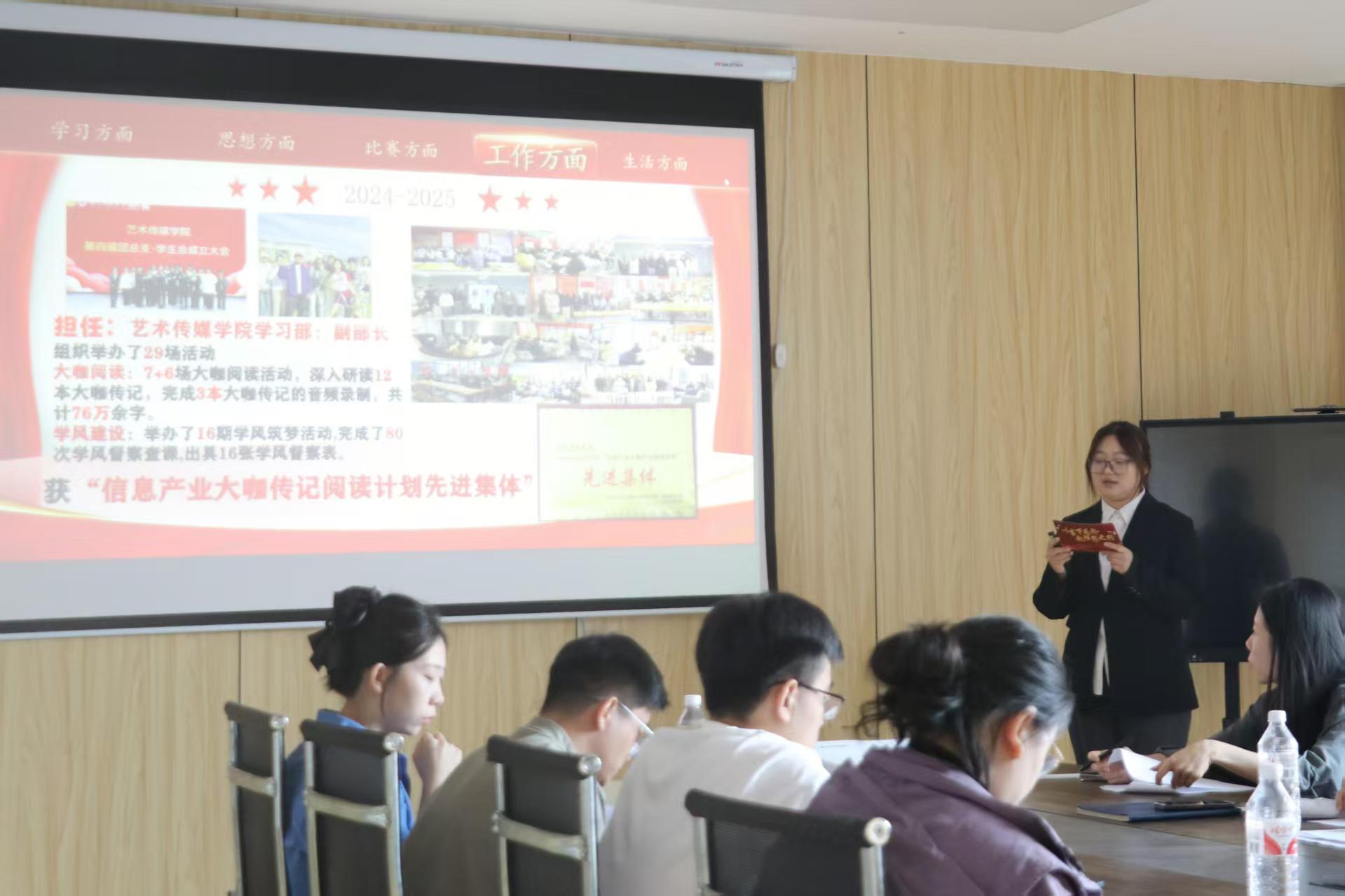 为公平、公正、公开选拔 2024-2025 学年国家奖学金推荐人选,激励全院学生勤奋向学、全面发展。9月28日上午,艺术传媒学院在学院会议室举办国家奖学金本科评审答辩会。学院副院长达世安、团总支书记任子璇,以及辅导员亓迪老师、张海园老师、刘文香老师担任本次答辩会评委,学生工作处彭王益阳老师以及新生辅导员现场观摩。答辩会由张海园老师主持,陈洁、满佳其、李晓雨、张鑫蕊四位候选人按照抽签顺序,依次答辩,展现艺传学子实绩,传播青春拼搏前行朝气。