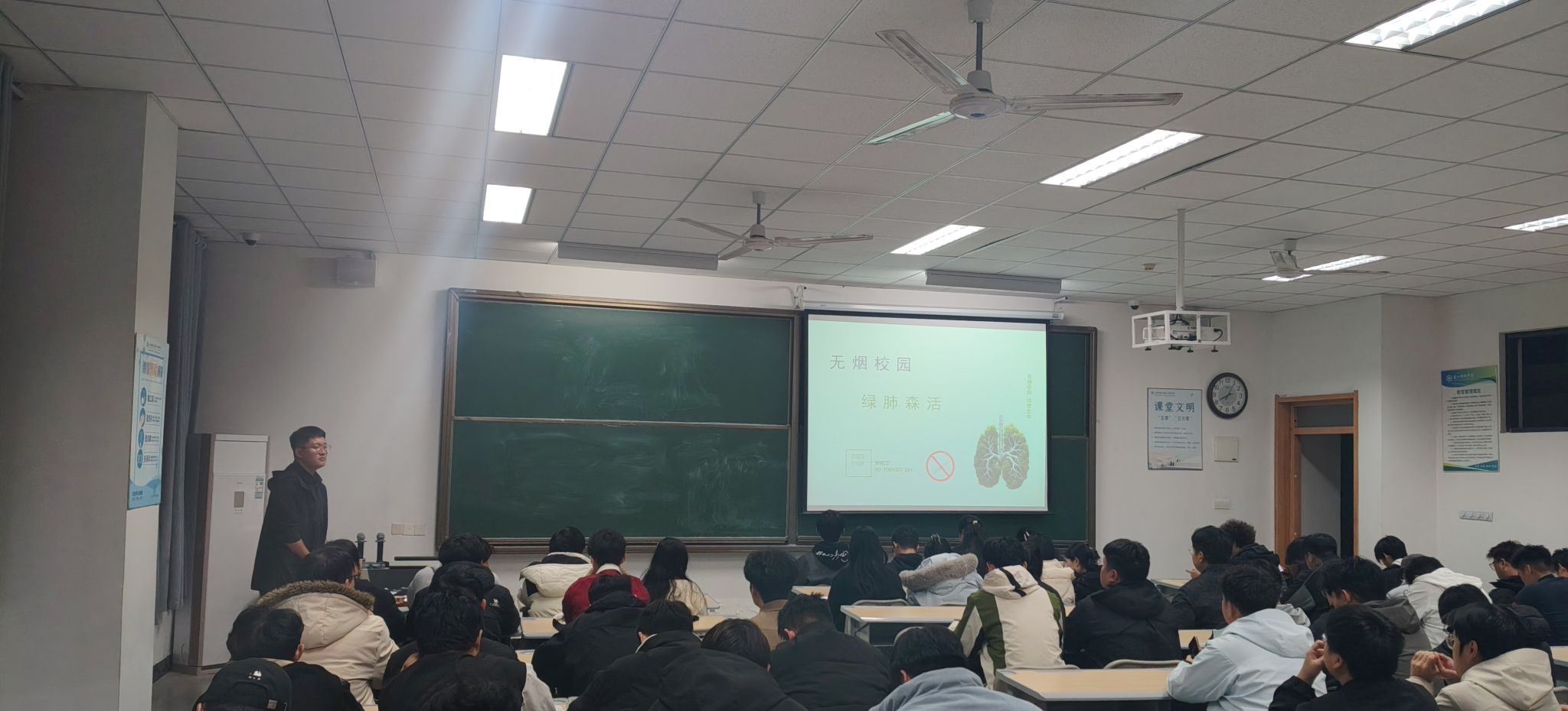 为营造清新、和谐、向上的学习和生活环境,刘安娜老师于周日晚上7:00,在J1-501教室召开“无烟校园,健康生活”主题班会。通过科学数据和真实案例,详细阐述烟草(包括电子烟)对个人健康、校园公共环境及校园消防安全构成的严重威胁,并向全体同学发出“拒绝烟草,从我做起”的倡议,希望同学们强化自律意识,严守校园禁烟规定,不在教学楼、图书馆、宿舍、食堂、体育馆等任何校园室内外公共场所吸烟,做到不吸烟、不递烟、不劝烟,更不随意丢弃烟蒂,用实际行动守护共同的校园空间。