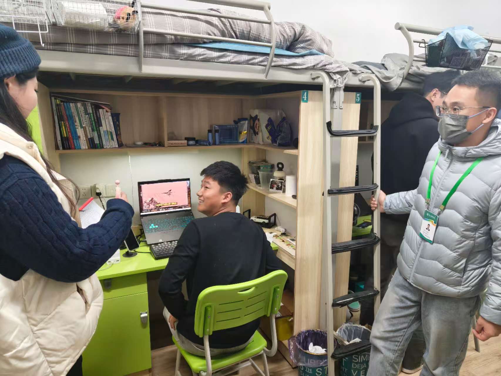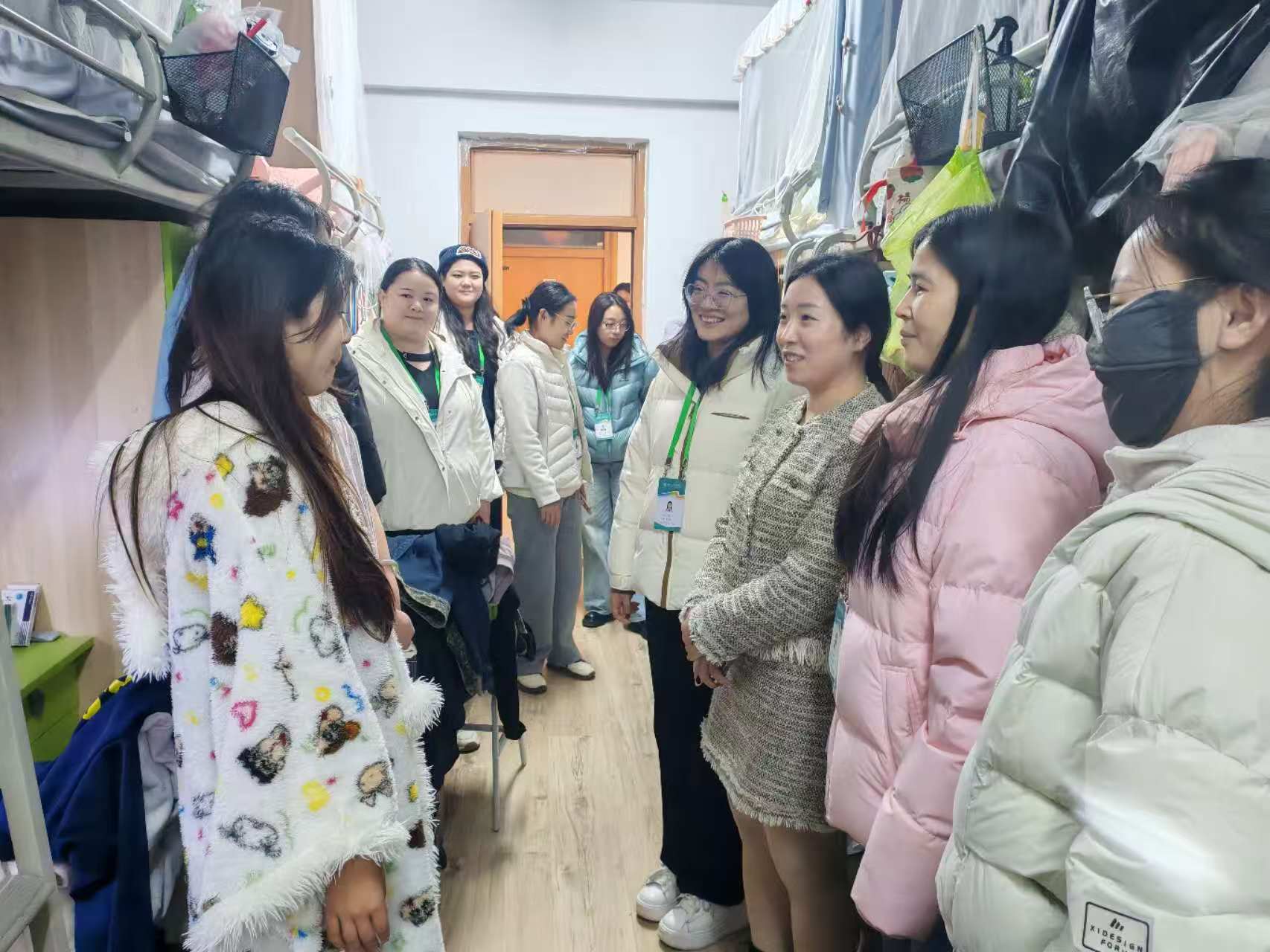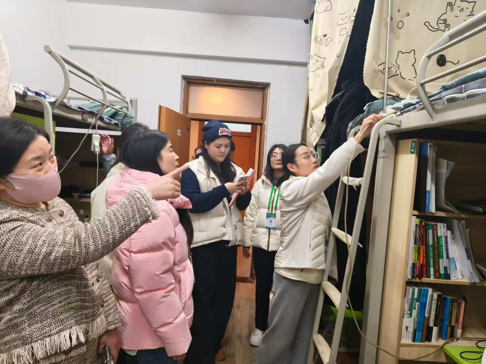 每走进一间宿舍,温馨融洽的氛围便扑面而来。老师们先是与同学们热情寒暄,随后自然地查看起宿舍的居住环境。从床铺整理的规整度、物品摆放的有序性,到书桌的整洁度、阳台的通风情况,老师们细细观察着宿舍的每一处细节,对同学们共同维护的干净整洁环境给予了肯定:“宿舍是大家在校期间的‘小家’,能把‘小家’打理得井井有条,既体现了大家的生活素养,也能让学习和休息更舒心。”对于个别需要改进的小细节,老师们也以建议的口吻温和提醒,让同学们在轻松的氛围中接受意见。