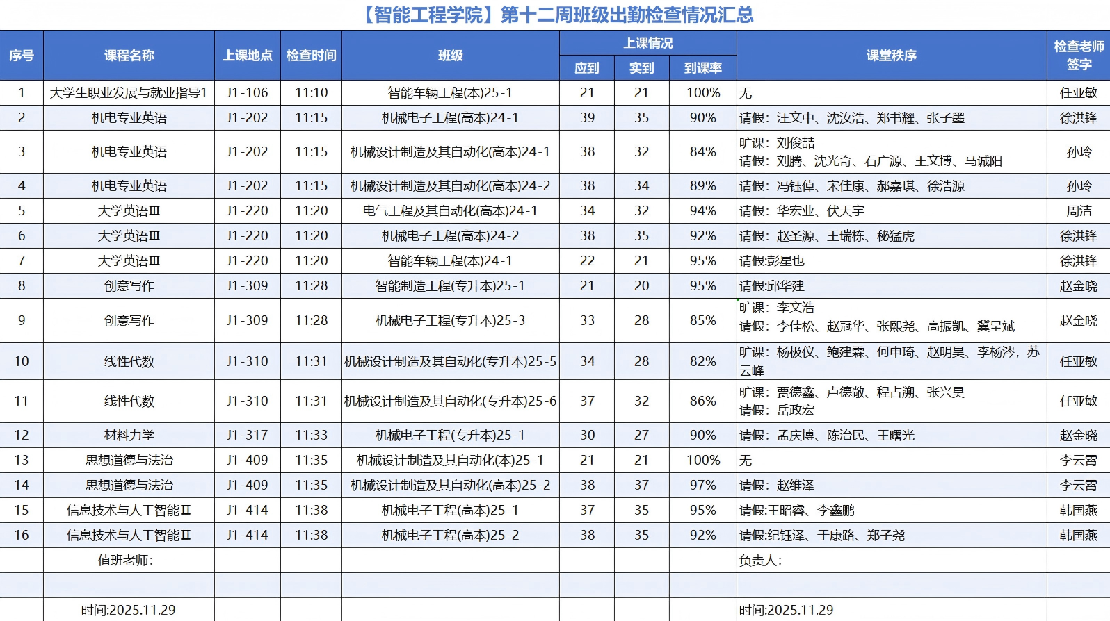 辅导员与任课老师们仔细沟通交流,确保查课的有效性和真实性,切实了解学生们在课堂中的真实状态。本周学风建设课堂检查活动,对智能车辆工程(本)25-1、智能车辆工程(本)24-1、机械电子工程(高本)24-1、机械电子工程(高本)24-2、机械电子工程(高本)25-1、机械电子工程(高本)25-2、机械电子工程(专升本)25-1、机械电子工程(专升本)25-3、机械设计制造及其自动化(高本)24-1、机械设计制造及其自动化(高本)24-2、机械设计制造及其自动化(高本)25-2、机械设计制造及其自动化(本)25-1、电气工程及其自动化(高本)24-1、智能制造工程(专升本)25-1、机械设计制造及其自动化(专升本)25-5、机械设计制造及其自动化(专升本)25-6共16个班级进行了检查,具体结果如下: