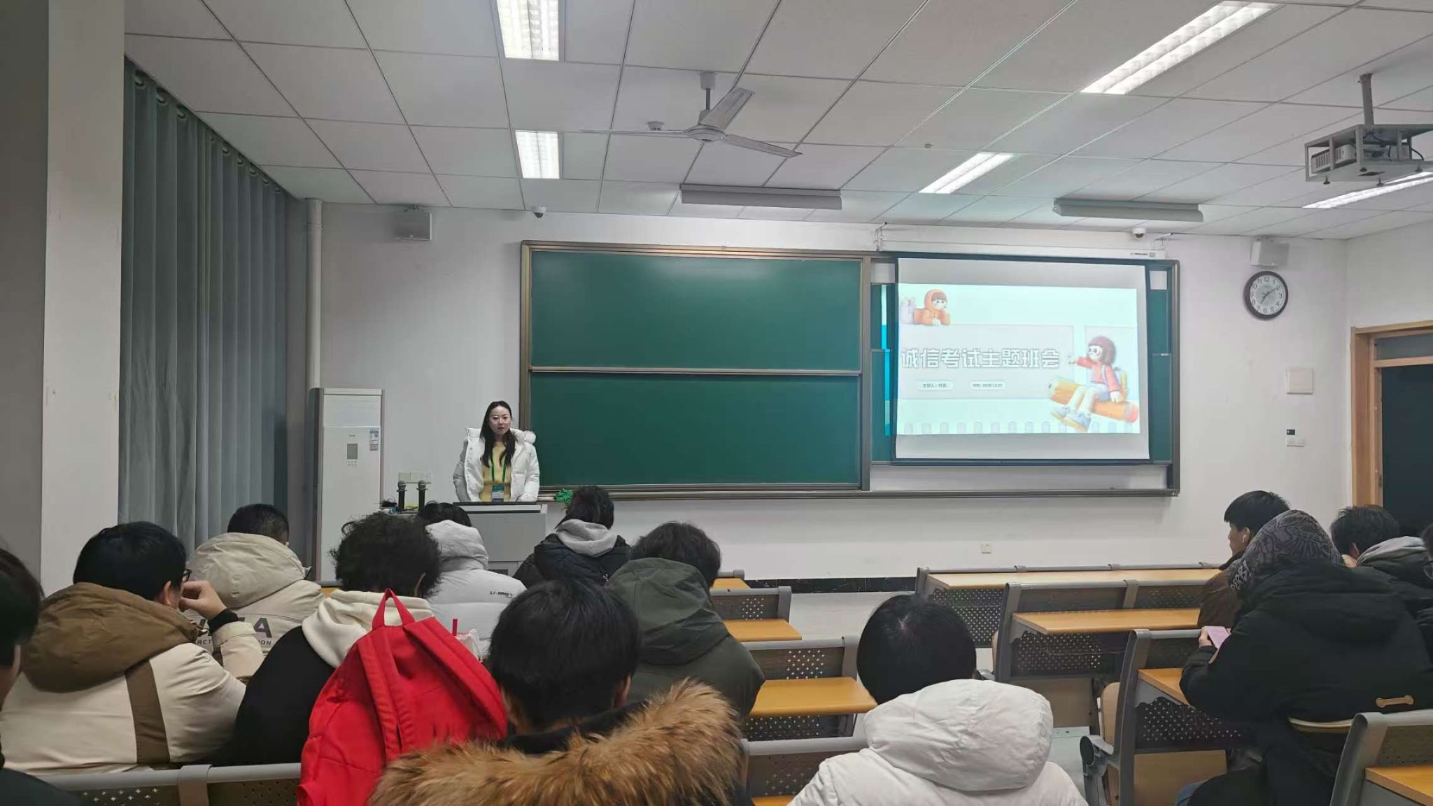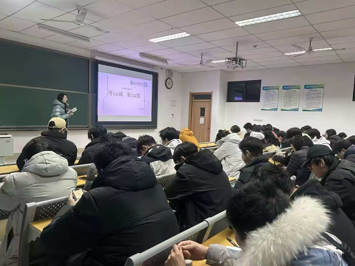 12月21日,辅导员刘安娜老师于J1-501举办了以“考之以诚,答之以信”为主题的诚信考试教育班会。班会上,辅导员深入讲解了诚信应考的重要意义,并结合学生手册课程考试管理规定条款内容以及典型警示案例,强调了违反考试纪律的严重后果。她指出,诚信不仅是考试的基本准则,更是每位学子立身处世的根本品质,号召全体同学端正态度、认真复习、凭实力取得真实成绩。参加班会的同学专注聆听,并在现场签署了《诚信考试承诺书》。大家纷纷表示,将自觉遵守考场纪律,坚决杜绝舞弊行为,共同维护公平公正的考试环境,以扎实学识和诚信品格迎接即将到来的考试。此次班会有力强化了学生的诚信意识与规则观念,为营造风清气正的优良学风奠定了坚实基础。