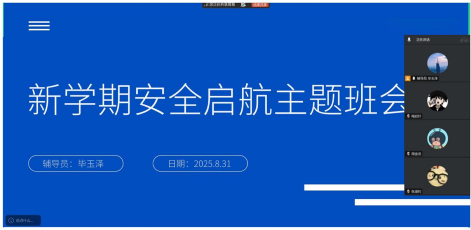 辅导员毕玉泽面向学生组织开展开学安全主题班会。班会围绕当前重点,覆盖多安全领域:提醒学生返校留意交通、财产和人身安全;警惕电信网络诈骗;因离校久,要检查宿舍电器和消防设施,排除隐患;关注食品和出行安全,保持健康习惯。旨在通过此次预警教育帮助同学们从“假期模式”转“开学模式”,牢记“安全第一”并付诸行动,共建平安校园环境。