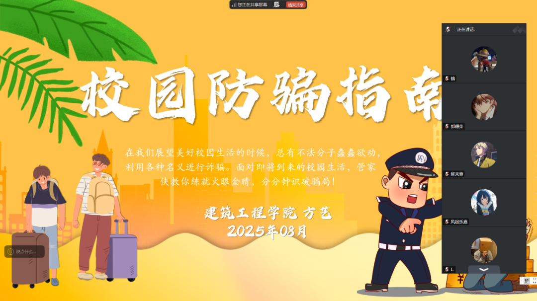 这场线上主题班会,涵盖了实用的安全知识,让同学们做好充足的开学准备来迎接新学期 。接下来,建筑工程学院将持续做好安全保障工作,陪伴同学们安全成长、顺利前行。