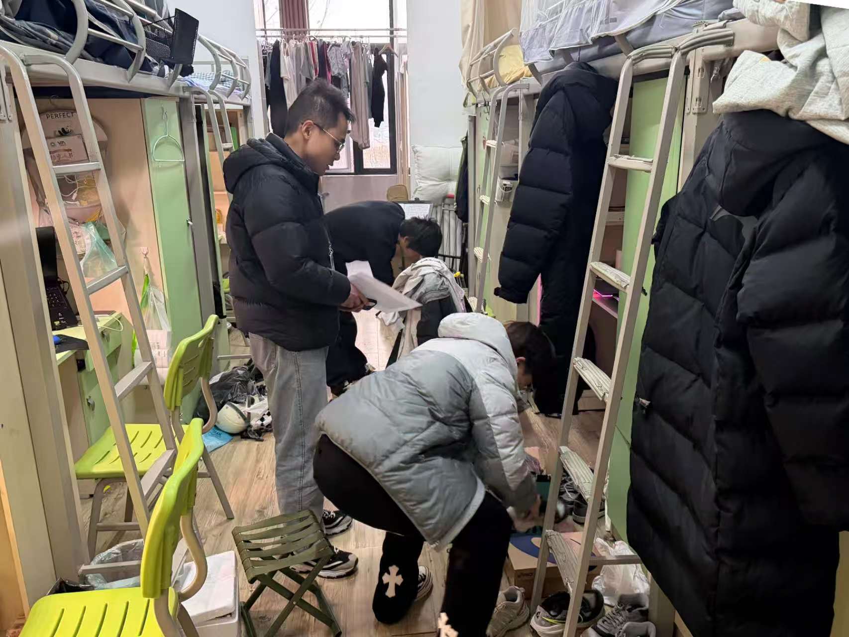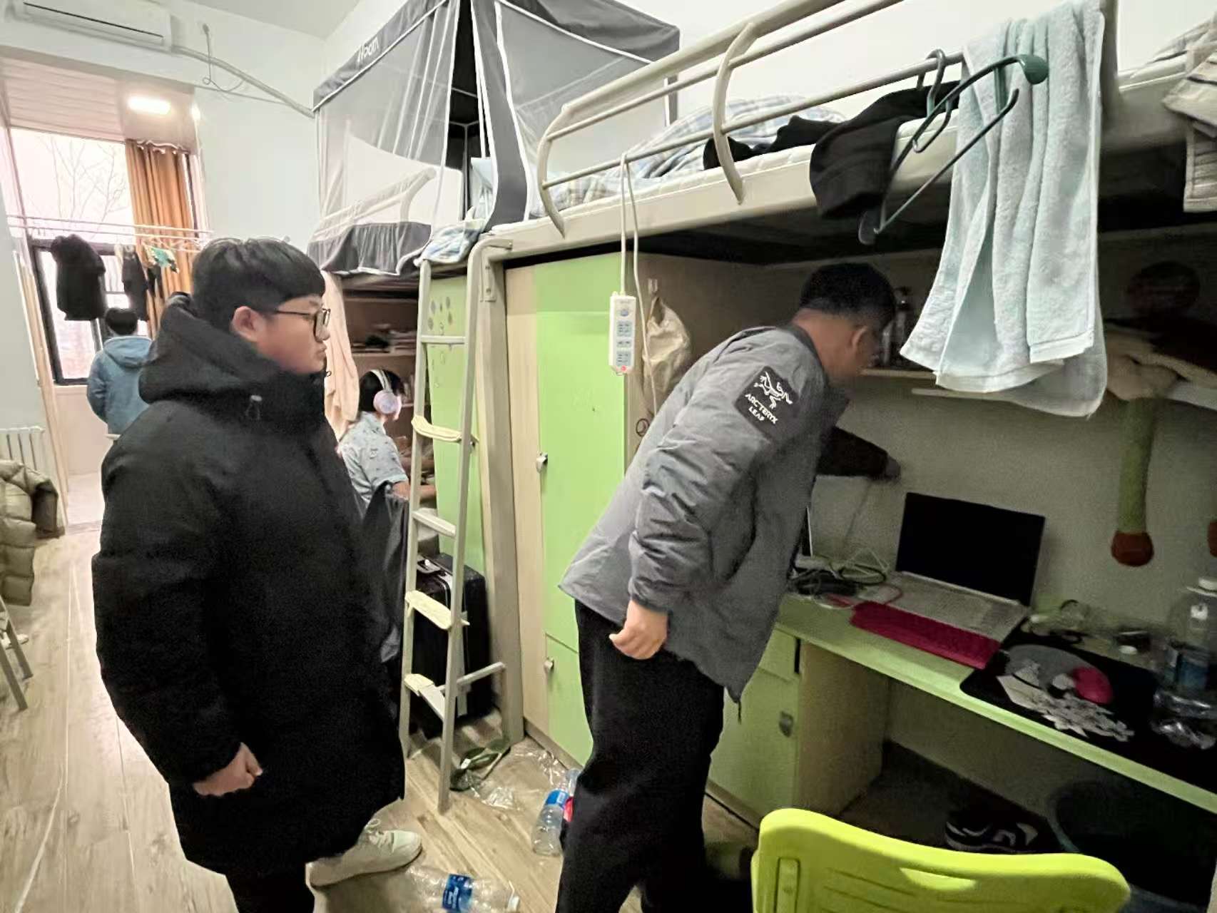 毕业生宿舍是本次走访的另一重点,对于已离校的毕业生宿舍,老师们逐一敲门确认,细心检查每一扇窗户是否锁紧、每一处水电开关是否关闭,并排查有无遗留杂物、易燃品等安全隐患。老师们将发现的问题逐一记录,及时整改,确保宿舍的安全与整洁。