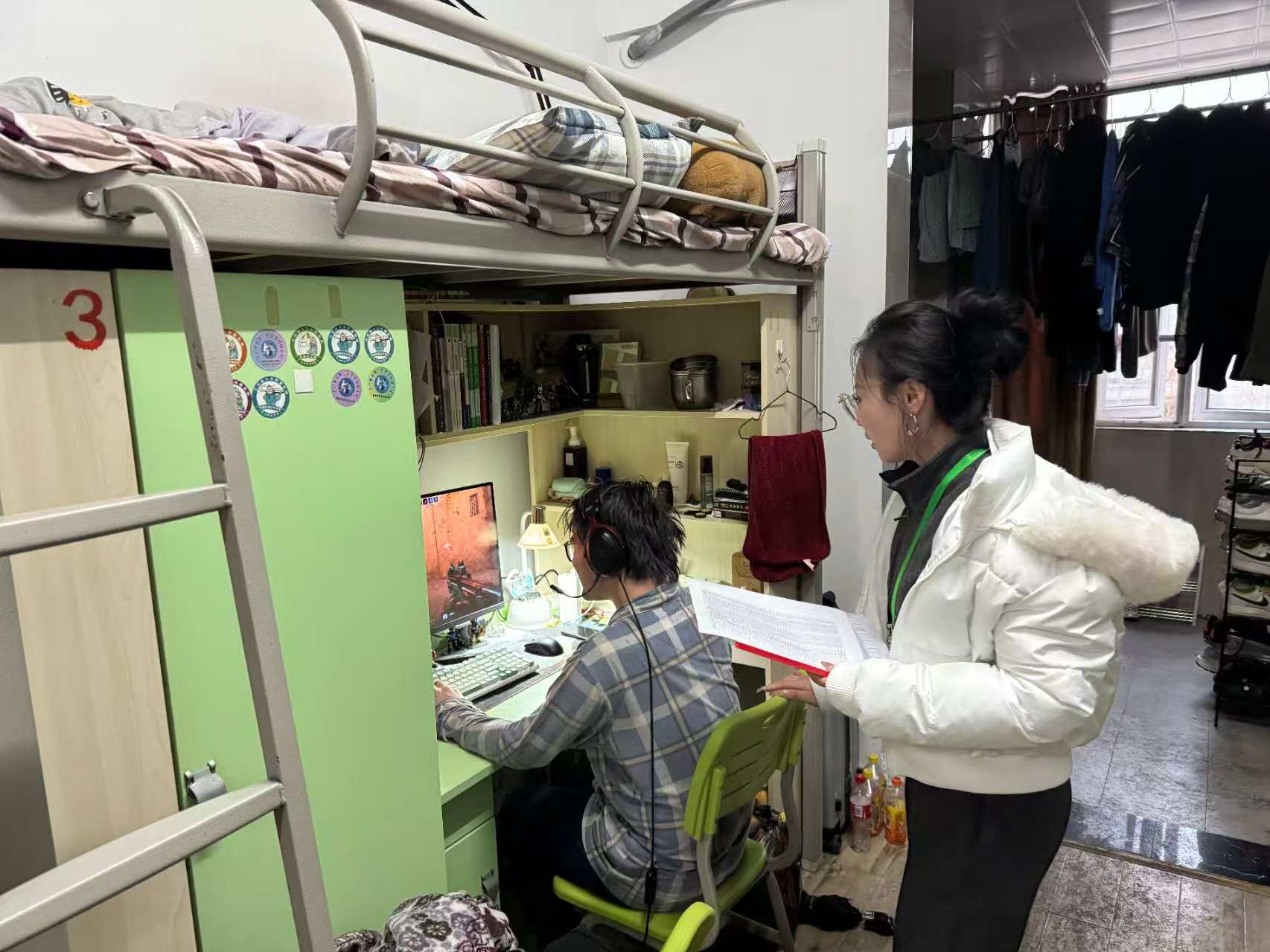 整洁有序的宿舍环境,是同学们身心健康与学习效率的重要保障。在走访中,不少宿舍展示了良好的卫生习惯,桌面整洁、物品归类有序,老师们给予了充分肯定,并鼓励他们发挥示范作用。针对部分宿舍存在的物品堆放杂乱、垃圾清理不及时、积存杂物等问题,老师们停下走访脚步,以引导代替指责,与同学们共同探讨收纳整理的方法,还与同学们共同动手清理,提醒大家假期离校前务必彻底清扫,避免滋生细菌或引发虫害,共同维护宿舍的清洁与美观。