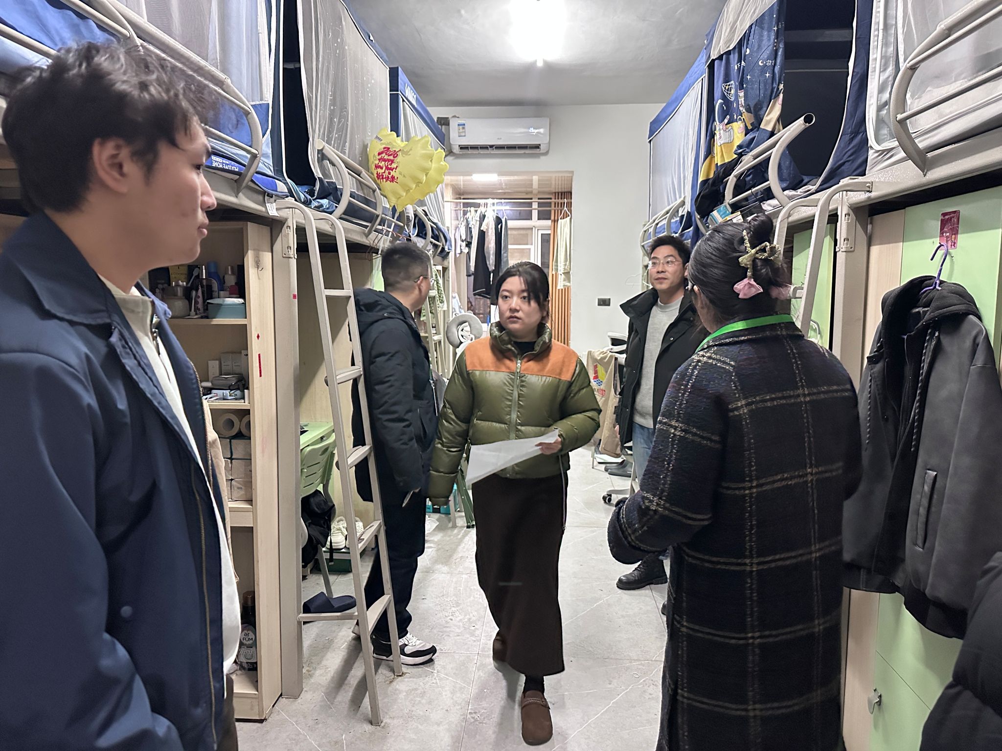 假期临近,为扎实筑牢校园安全防线,切实保障学生人身与财产安全,系统排查宿舍区域潜在风险点,营造安全有序、整洁规范的住宿环境。2025年12月30日智能工程学院全体辅导员深入东岳书院A栋,汶阳书院C、D栋开展节前寝室走访活动并进行宿舍安全隐患排查。