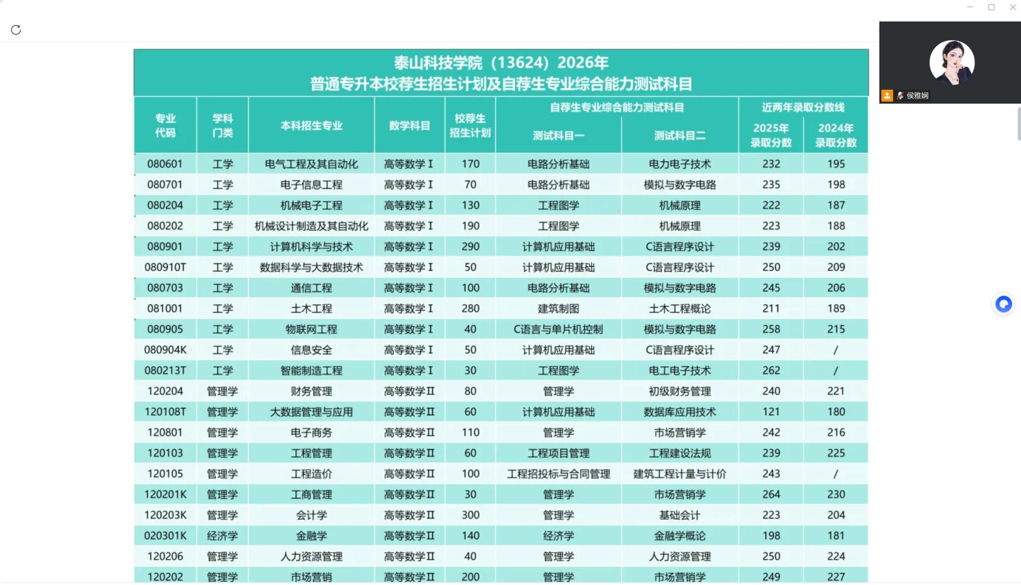 此外,为进一步提升政策解读的专业性与精准度,强化宣讲效果,大数据学院主动对接招生处,特邀招生处马晓雨老师开展专场线上政策解读宣讲会。本次宣讲会专门面向专科毕业班有专升本意向的学生及家长共同参会。宣讲过程中,马晓雨老师围绕学生和家长最关心、最关注的核心问题展开细致讲解,详细介绍了2026年专升本自荐考试的报名流程、报名条件、考试方式、考试科目及时间安排,结合历年报考数据,系统分享我校录取分数线,并与同类院校进行客观对比分析,直观展现学校办学优势与报考价值。同时,老师结合多年招生工作经验,为学生提供科学的志愿填报指导与备考建议,鼓励大家合理定位、积极报考,稳步实现升学目标。整场宣讲内容详实、重点突出、实用性强,有效解决了学生和家长在备考、报考中的迷茫与顾虑。