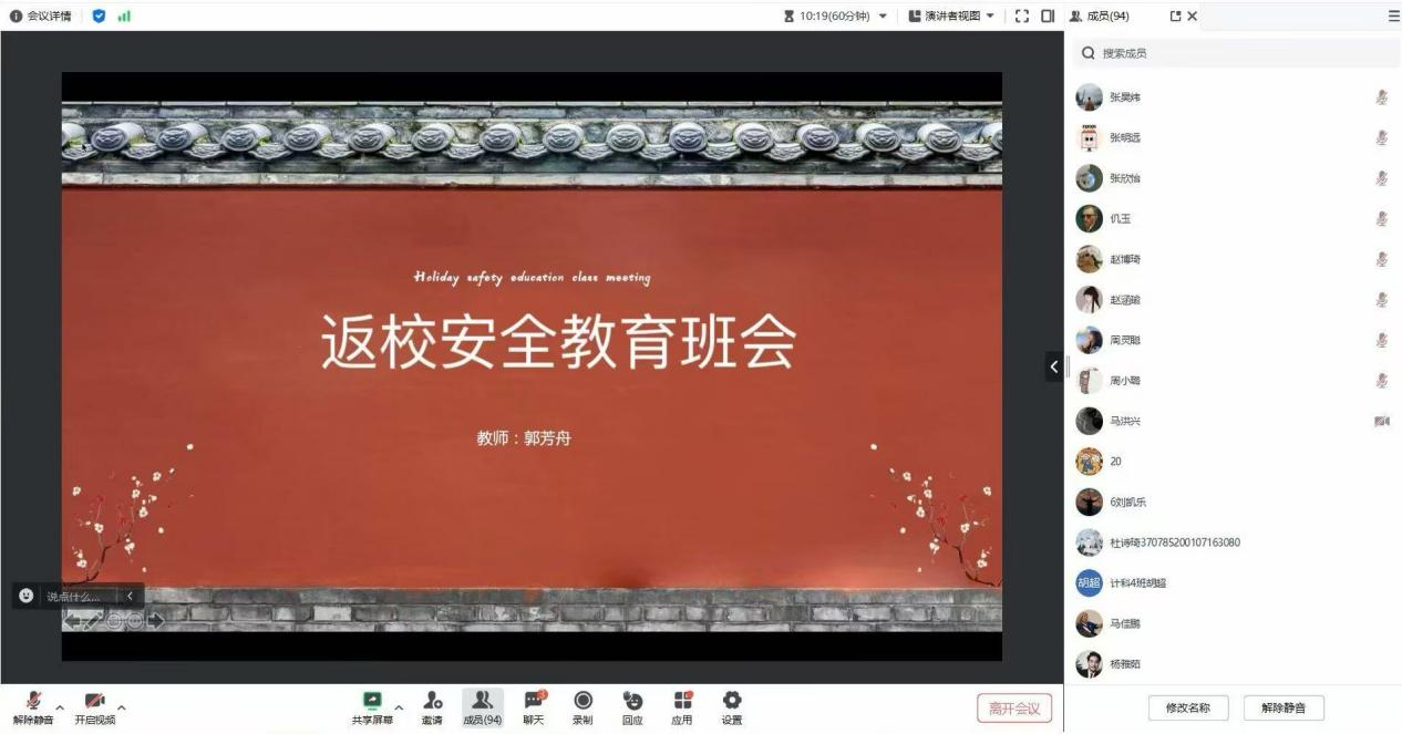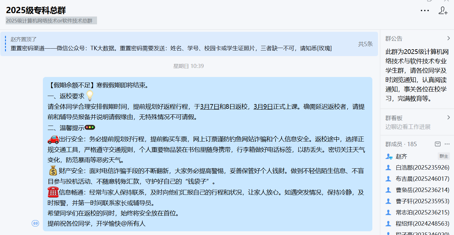 寒假尾声,新学期将至,为切实保障学生平安有序返校,筑牢校园安全防线,泰山科技学院大数据学院组织全体辅导员通过线上班会、班级群通知、精准推送提醒等多种形式,开展全方位、多维度的返校安全教育工作,为学生顺利开启新学期保驾护航。