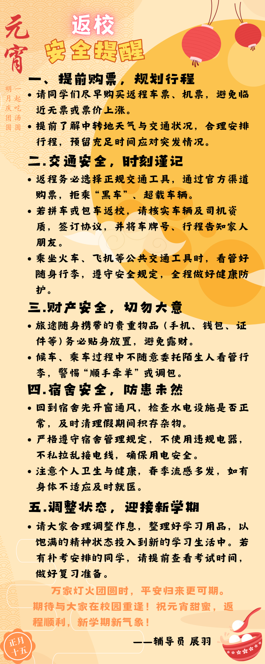 针对返校途中的安全重点,辅导员们重点强调交通与人身财产安全。要求学生务必选择正规营运交通工具,坚决拒乘无牌无证、超员超载的“三无车辆”,自驾、拼车返校需核实资质、遵守交规;在车站、车厢等人流密集场所,妥善保管身份证、学生证等重要证件及贵重物品,贴身存放财物,不接受陌生人食品饮料,不轻信陌生搭讪,谨防盗抢与诈骗,同时保持通讯畅通,及时向家长和辅导员报备行程动态。