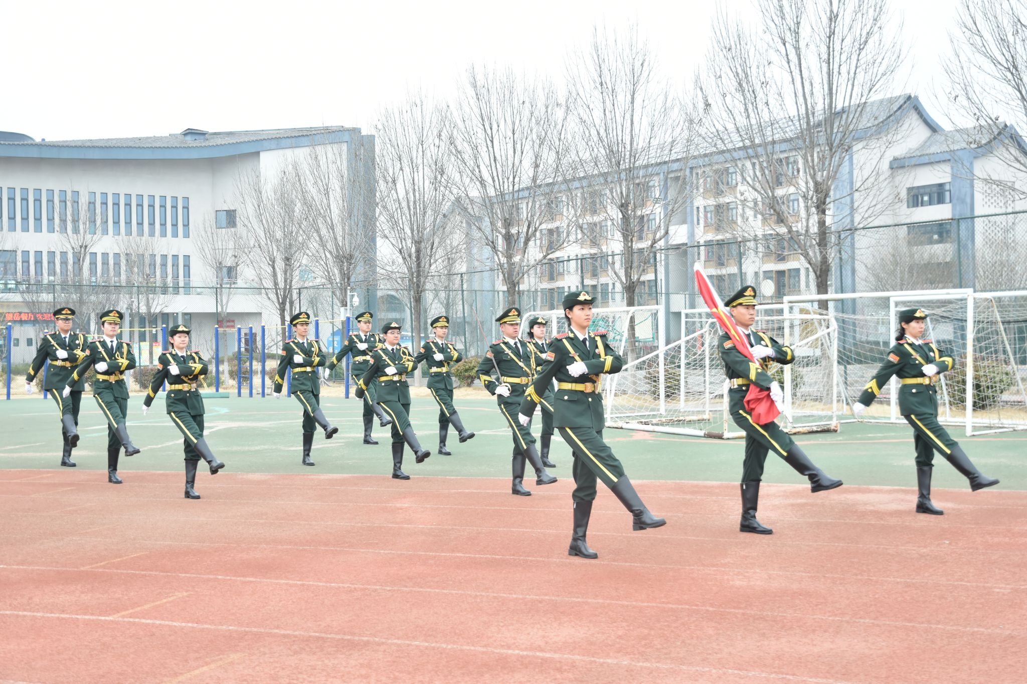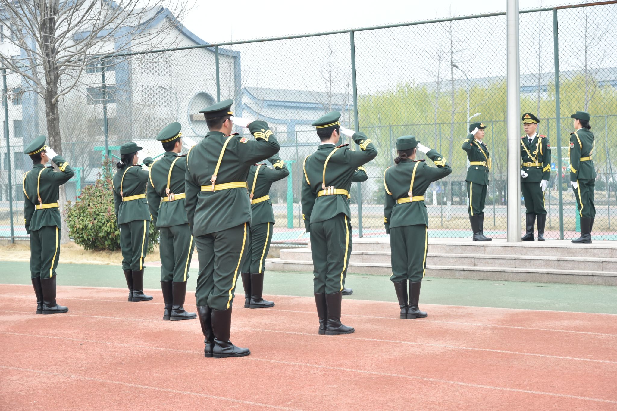 随着主持人宣布升旗仪式正式开始,国旗护卫队队员迈着铿锵有力、整齐划一的步伐,护送国旗走向升旗台。全体师生肃立注目,静待国旗升起。当雄壮激昂的《中华人民共和国国歌》响彻全场,鲜艳的五星红旗迎着朝阳缓缓升起,在场所有人神情庄重,向国旗致以最崇高的敬意。