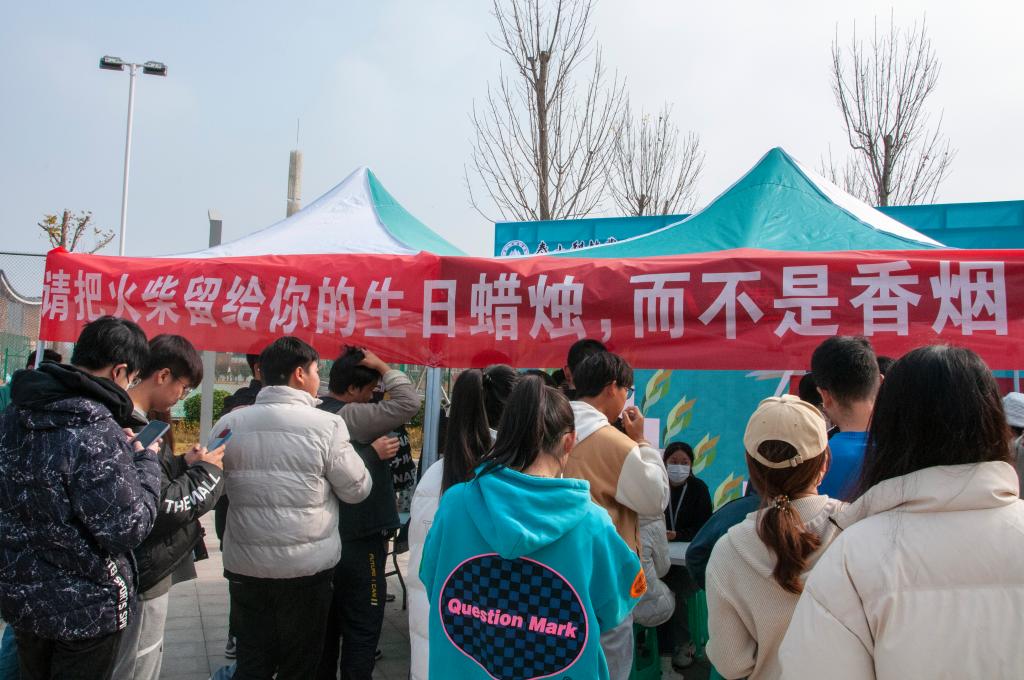 线下活动开始,主持人组织同学们在禁烟横幅上签名,以表明禁烟决心,大家纷纷争当“禁烟卫士”,写下宣传口号或标语,为“无烟校园”的实现建言献策。参加活动的同学也通过朋友圈、QQ空间等渠道宣传自己的禁烟标语,呼吁身边人一起加入禁烟行列。组织者通过知识竞答等形式向同学们普及烟草及电子烟对身心健康成长的危害,生动形象讲解了长期吸烟对人体肺部的伤害,引导大家提高戒烟、禁烟意识,鼓励大家寻找合理宣泄方式,健康生活,远离烟草。大家积极互动,纷纷表示将远离烟草,健康生活。活动最后,组织者为大家分发纪念品,提倡大家为无烟校园出一份力。