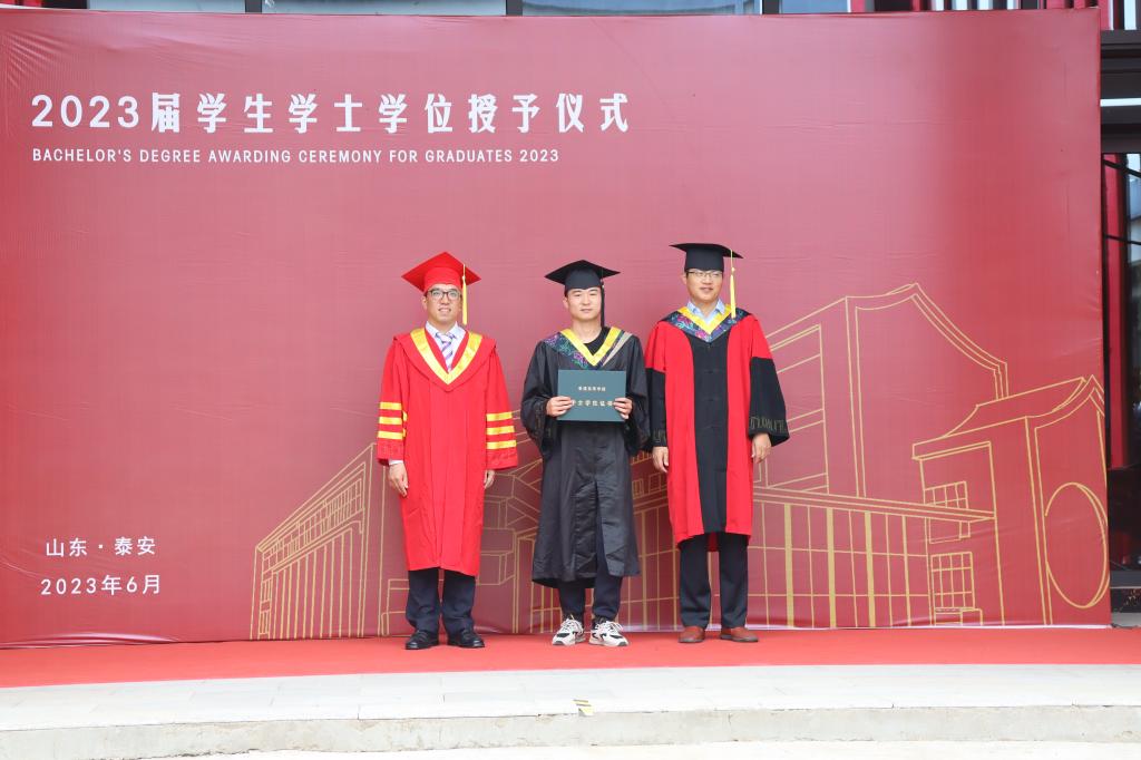 仪式开始,泰山科技学院副校长谢承红登台拨穂,智能工程学院副院长张涛然为毕业生们颁发学位证。