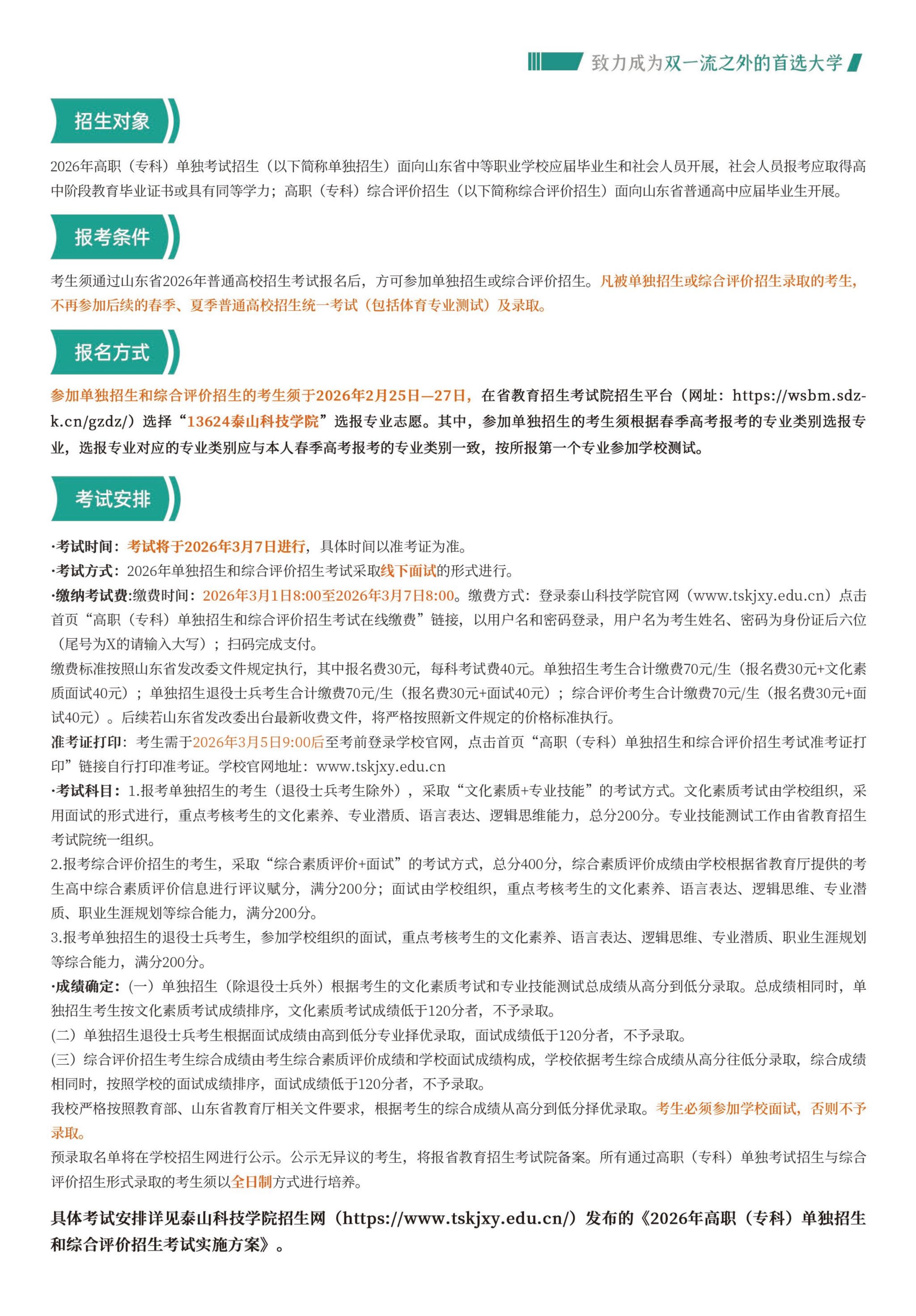 参加单独招生和综合评价招生的考生须于2026年2月25日—27日,在省教育招生考试院招生平台(网址:https://wsbm.sdzk.cn/gzdz/)选择“13624泰山科技学院”选报专业志愿。