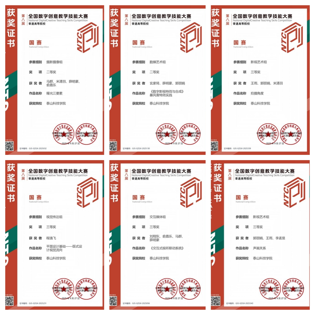 9月28日,第八届全国数字创意教学技能大赛(NCDCTS)全国总决赛在长沙理工大学圆满落幕。泰山科技学院艺术传媒学院6支教师团队作品表现优异,从全国574所高校的4581件参赛作品中脱颖而出,成功入围国赛,最终荣获二等奖2项、三等奖4项。