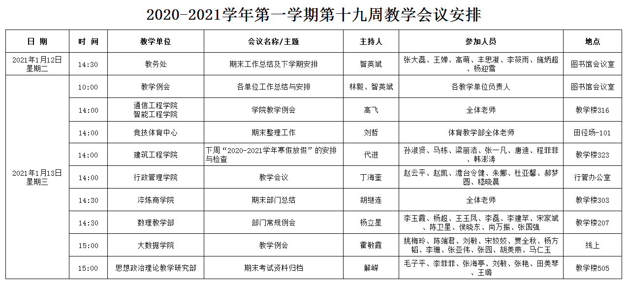 2020-2021学年第一学期第十九周教学会议安排
