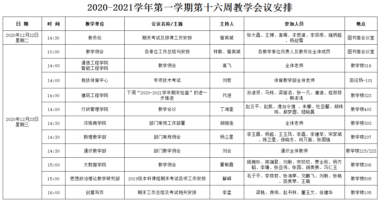 2020-2021学年第一学期第十六周教学会议安排